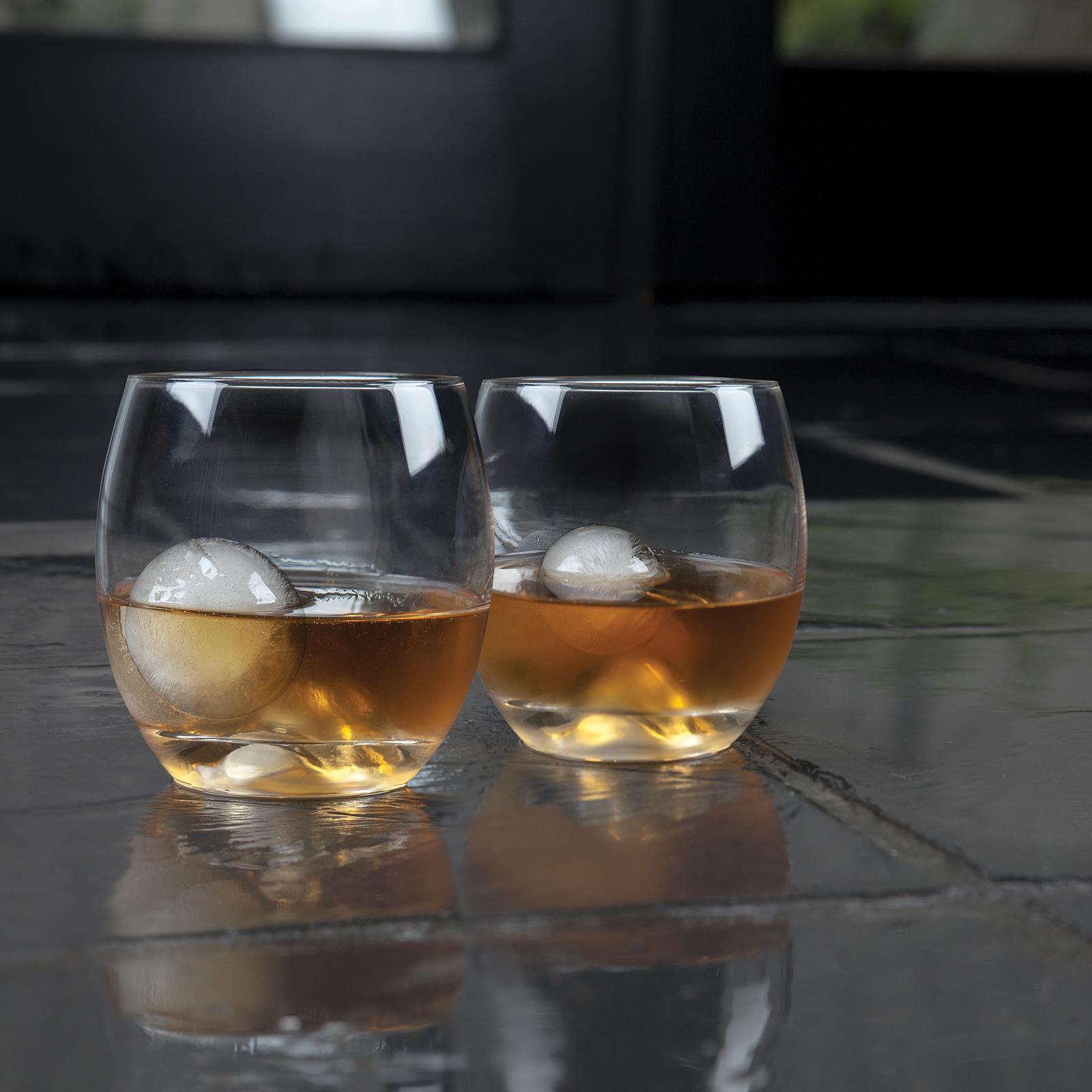 Each crystal liquor tumbler is sculpted with a circular channel to match the exact proportions of the ice ball made by its accompanying silicone ice mold. Drop the icy sphere into the channel to chill your liquor faster and last longer than coarse cubes. Each set includes two crystal tumblers and two silicone ice molds. Instructions: Fill the hollow silicone ball with water and place in the freezer for at least 4 hours. Using the thumb grip;remove the cap to easily access the spherical ice ball inside. Place the ice sphere in your glass of whiskey, scotch, bourbon or any other liquor of your choice. The slow-melting ice ball will naturally roll in a circular motion on the base of your glass as you sip, cooling the liquor evenly.
