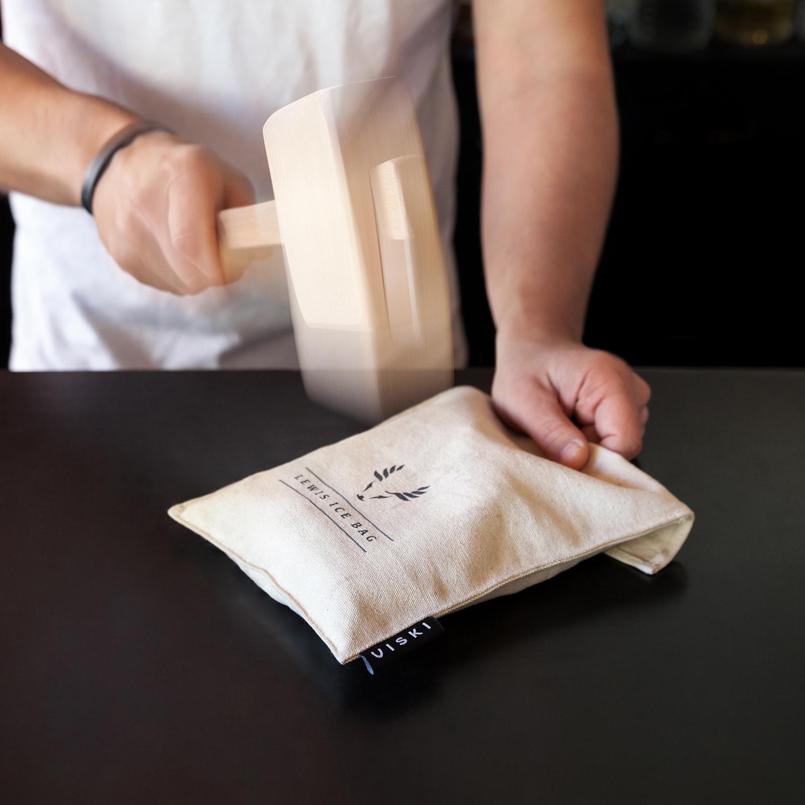 Cubes are for vodka sodas - real cocktails get superior ice. Crush your own for juleps, swizzles and smashes in this professional-grade canvas ice bag, based on the original Lewis design and accompanied by a heavy hardwood mallet. Canvas material naturally absorbs excess water, creating a dryer ice. For home and craft mixologists alike.