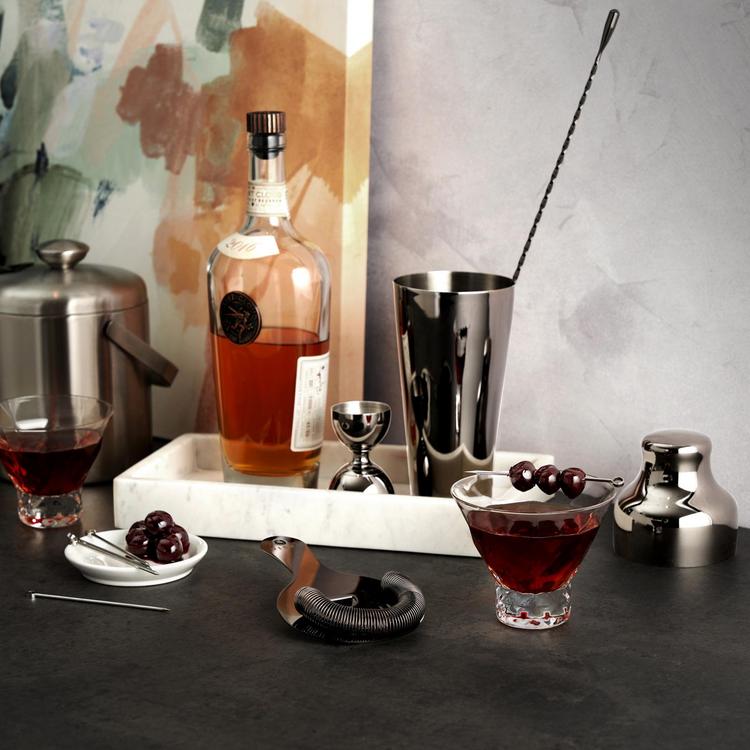 There’s no reason a barware essential has to look basic, too. Shake up your bar collection with our contoured gunmetal black version of a classic French-style shaker. If you’re going to shake up noticeable cocktails, do it in an eye-catching way. An unobtrusive flat handle, broad face and tightly coiled spring define our professional-grade copper Hawthorne strainer, while two symmetrical sets of perforations provide the bonus of making split pours second nature. Designed for the smoothest swizzling and stirring, our classic teardrop-tipped barspoon twists its way from a concave spoon bowl along a 40 centimeter stem to end in a perfectly rounded head. Precisely balanced for effortlessly adept mixology. Create cocktails and other refreshments with this rounded gunmetal black double jigger, a throwback to post-Prohibition that sets an unparalleled standard for bar carts and bartenders alike. A slender hourglass frame makes mixing spirits a breeze, while inner rings mark the perfect pour.