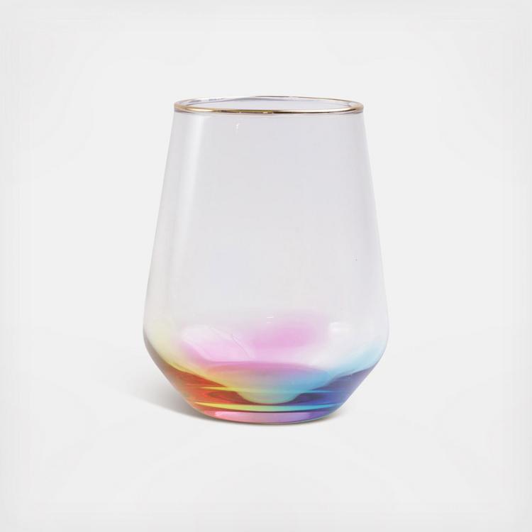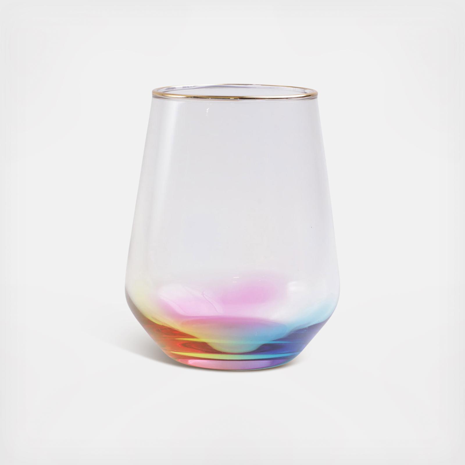 Add sparkle to any setting with a gilded gold rim and varied colored glass that refracts light on the Rainbow Stemless Wine Glass.