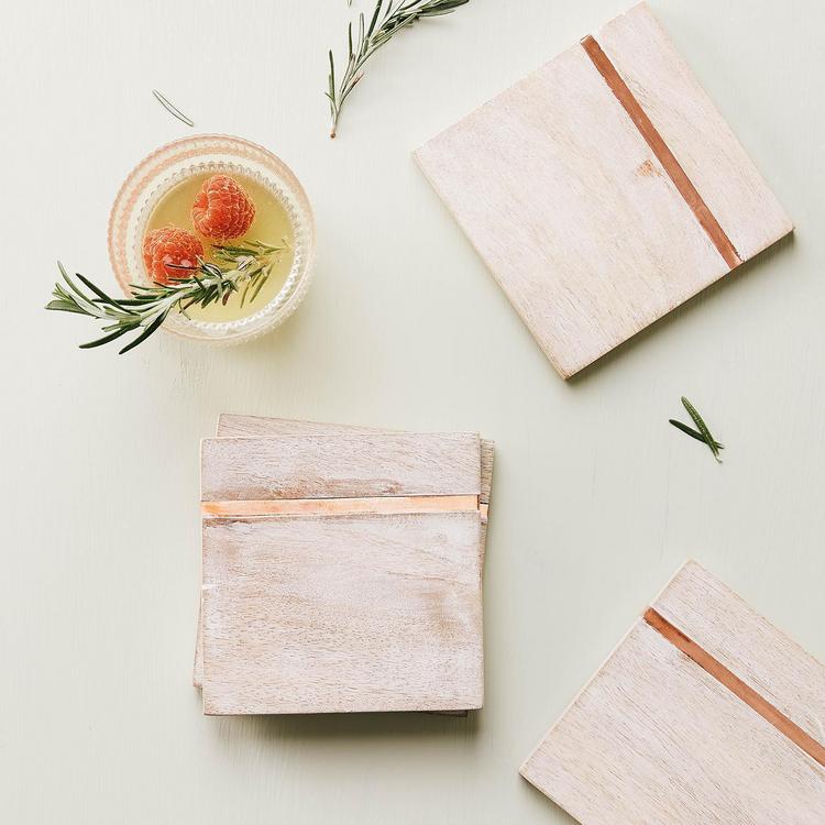 Protect tabletops from heat, cold, and messy drips in chic style with a foursome of coasters hand crafted from sustainable, durable mango wood. Boasting an unexpected a stripe of solid copper, the pleasing combination of contemporary shine and richly grained, whitewashed mango wood adds a contemporary, yet rustic touch to your décor.
