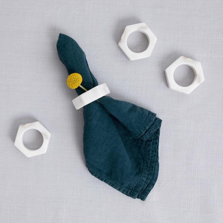 A no fuss way to add style to a dinner party or takeout on a monday night. Just slip paper or fabric napkins into these marble hexagon napkin rings and elevate any dinner into an event.