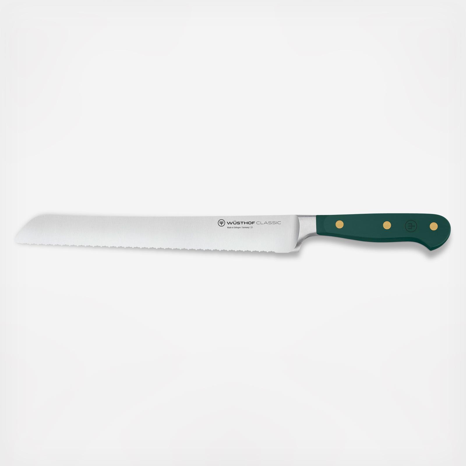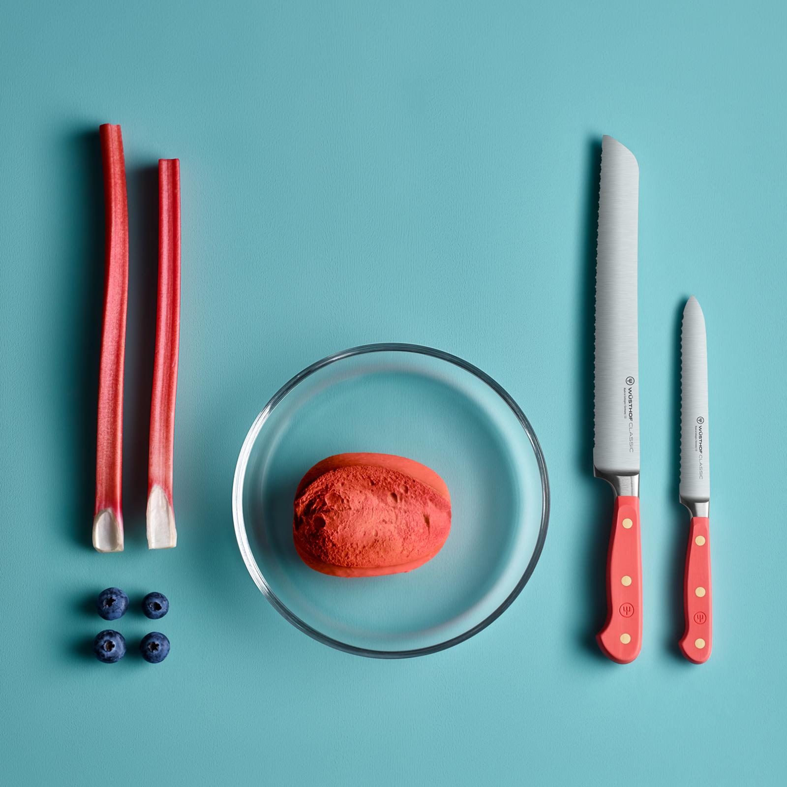 WÜSTHOF's precise, double-serrated edge makes a clear difference with this bread knife: in contrast with a single-serrated edge, this knife has serrations within the serrations, meaning that it remains sharp for longer, requires less pressure and is suitable for very precise, smooth cuts. Bread with a hard crust is not crushed when sliced with this double-serrated blade, while bread with a soft crust is also sliced cleanly, without any tearing of the delicate surface. The small blunt section at the tip of the blade is designed for extra crusty loaves. As you slice down to the bottom of the loaf, simply lift the handle up and use the blunt tip to slice through the hard bottom crust.