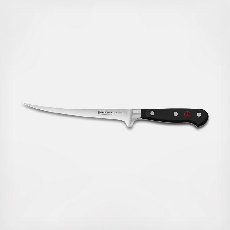 Best-selling collection for generations, Classic full-tang knives are precision-forged from a single piece of an exclusive high-carbon stainless steel. Classic knives feature a new handle design made of a highly durable synthetic material – Polyoxymethylene (POM) – which has a tighter molecular structure to resist fading and discoloration. A Classic Fillet Knife has a very thin flexible blade used for deboning and filleting fish. The long narrow blade enables the knife to move smoothly along the backbone of the fish and easily removes the fish skin.