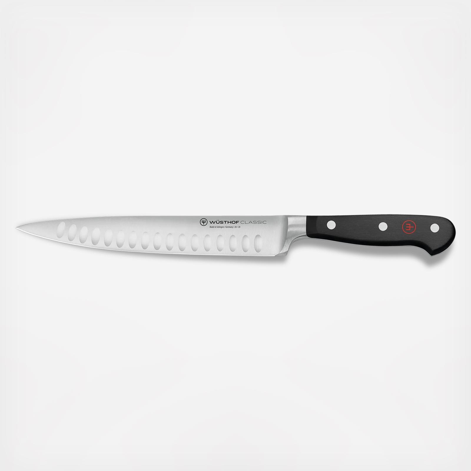 Best-selling collection for generations, Classic full-tang knives are precision-forged from a single piece of an exclusive high-carbon stainless steel. Classic knives feature a new handle design made of a highly durable synthetic material – Polyoxymethylene (POM) – which has a tighter molecular structure to resist fading and discoloration. The Classic Carving Knife has a longer and narrower blade than a Cook’s Knife. This allows for the knife to cleanly cut through meats. The pointed tip is designed to help guide meat away from the bone. The hollow edge is crafted with evenly spaced vertical indentations, which create small air pockets between the blade and the food. These small air pockets gently push food off the blade and reduce friction and drag. This knife allows cooks to effortlessly prep a wide array of fresh produce, including starchy vegetables like potatoes, which tend to stick to a knife’s blade.