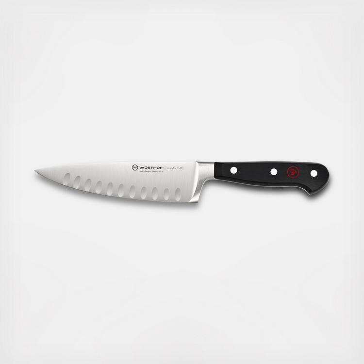 The all-rounder in the kitchen: the most important piece of basic equipment for every home and professional chef, the Hollow Edge Chef's Knife is suitable for most tasks in the kitchen, for the widest variety of cutting and gripping techniques, it makes food prep a pleasure. The hollow edge is crafted with evenly spaced vertical indentations, which create small air pockets between the blade and the food. These small air pockets gently push food off the blade and reduce friction and drag.