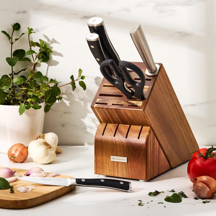 Classic ikon starter knife block set is a sleek and sophisticated handle with a double bolster for exceptional balance, beauty, and the ultimate cutting experience. It's design, ergonomics, and quality perfected.