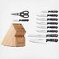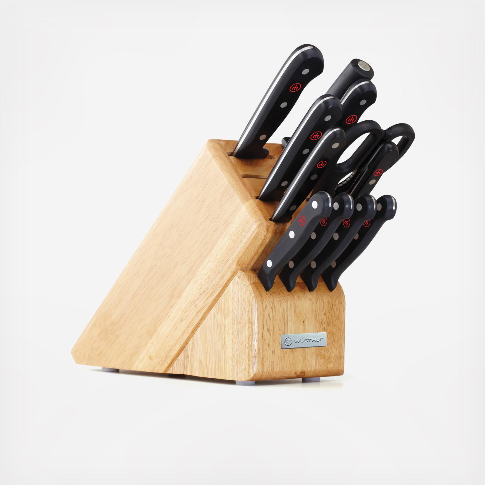 Whether you're a professional chef or just beginning to assemble your kitchen, this Gourmet 12-Piece Knife Block Set by Wusthof equips you with all the blades and tools you'll need for efficient, attractive cooking. The sleek beech wood knife block provides blade storage and protection while complementing any kitchen decor.