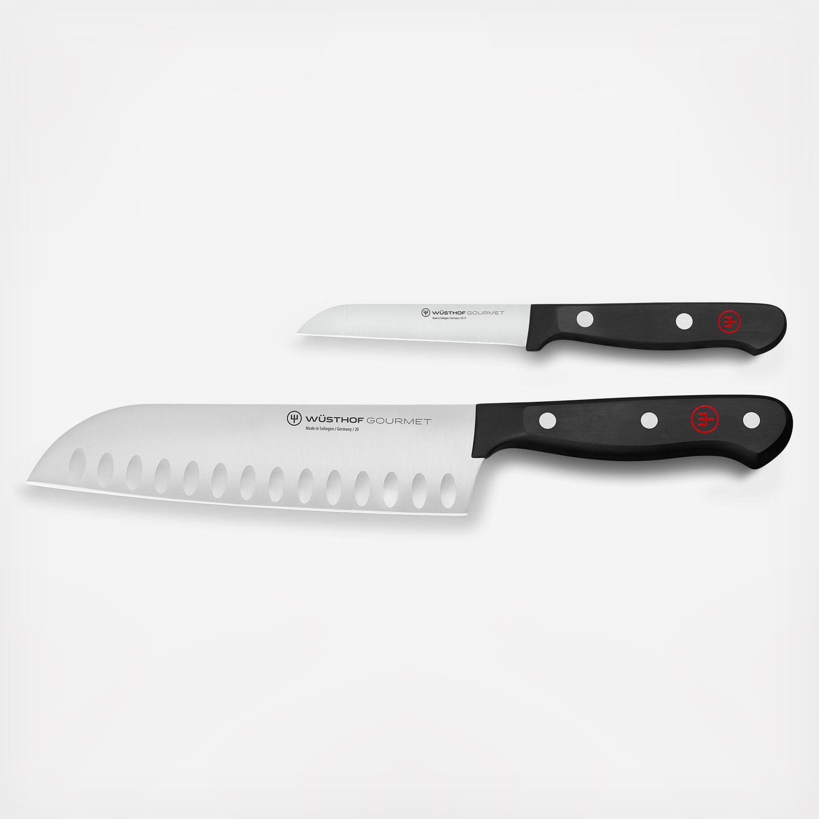 This is an ideal starter set for beginning cooks who are short on space. The Santoku knife is just right for slicing, dicing, and mincing, and its hollow edge divots create pockets of air that keep food from sticking to the blade. The paring knife is ideal for more intricate knife work such as peeling or coring fruit; cleaning and cutting vegetables; mincing items like shallots, onions, and herbs; and removing eyes from potatoes.
