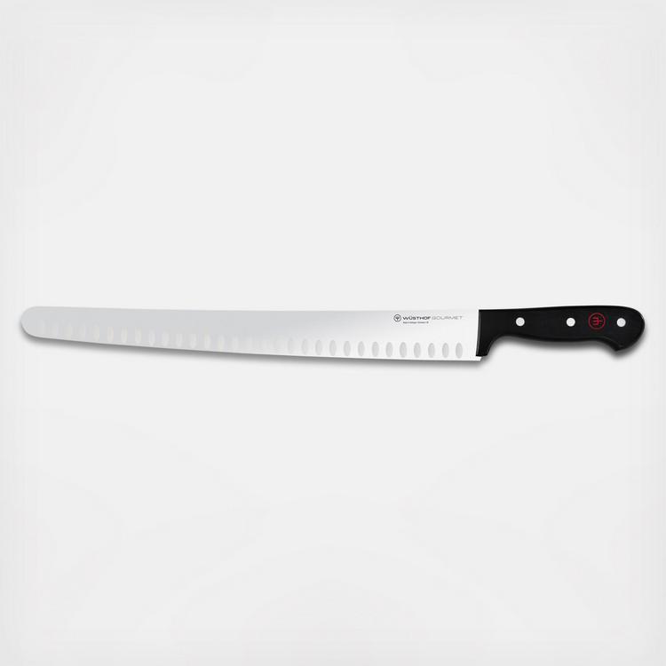 Gourmet laser-cut knives are crafted in the company’s factory in Germany. Well-balanced and durable, Gourmet knives are made of high-carbon stainless steel. The Gourmet Hollow Edge Brisket Slicer is a long slender blade with a rounded tip. The blade is longer than many other knives so that it can slice across large roasts in one swift movement. The hollow edge contains evenly spaced vertical indentations that create small air pockets between the blade and the food. These small air pockets gently push food off the blade and reduce the friction and drag when slicing.