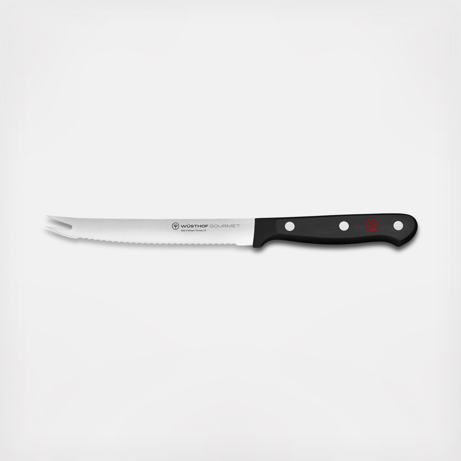 The Gourmet Tomato Knife has a serrated edge that enables the blade to slice through tomatoes without damaging the delicate fruit inside. The fork tip is ideal for picking up the thinly sliced produce for serving. Much like a serrated utility knife, the tomato knife could also be used to cut citrus fruits or other small fruits and vegetables.