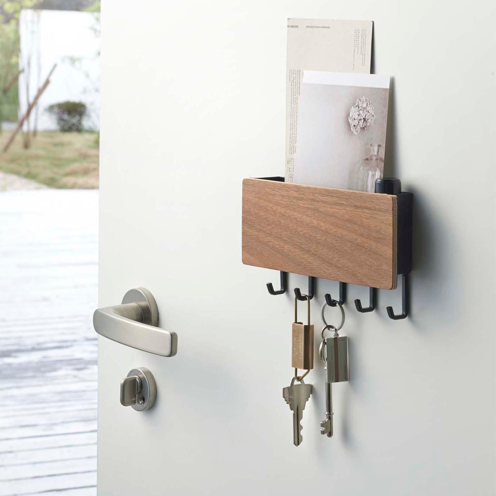 Say calm, cool, and collected with the Rin Magnet Key Hook by Yamazaki. Organization is effortless with this clean and modern key rack. Powerful magnets adhere to any metal surface, like an office door or refrigerator. This stylish piece, designed with steel and wood, has hooks for keys and a top shelf for mail, sunglasses, or any other easy access items.