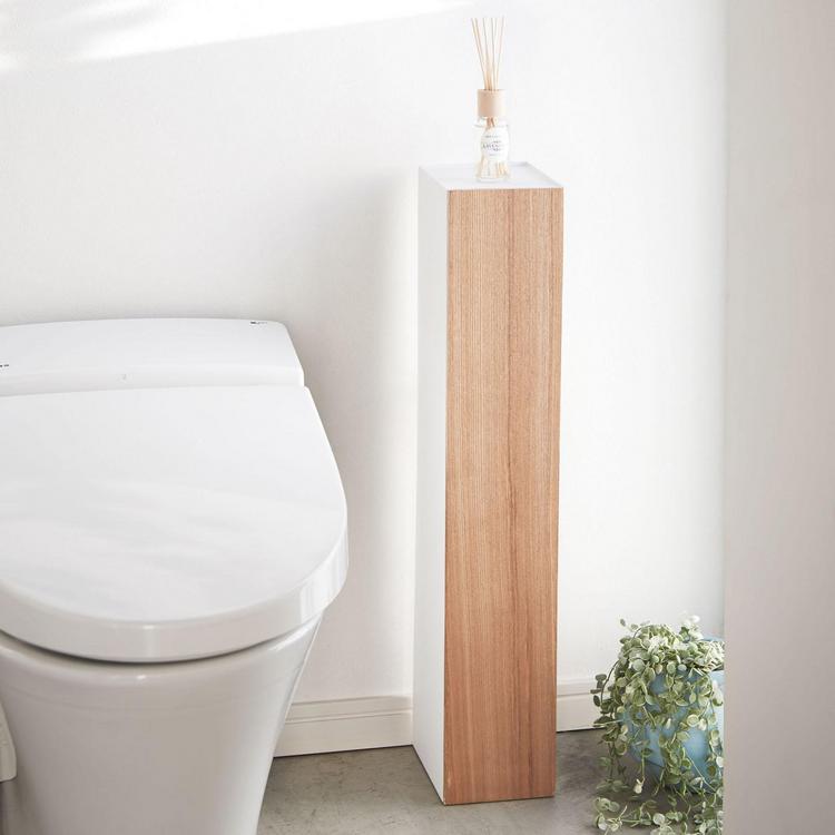 This slim yet neat and stylish toilet organizer by Yamazaki tucks into the smallest of bathroom spaces, keeping toilet paper and cleaning supplies out of view but within reach. It has 3 shelves. It’s made of wood and steel. Designed in Japan.