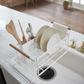 This over-the-sink dish drainer by Yamazaki is made of elegant combination of steel and wood and has an adjustable bottom, which allows it to fit to different sizes of sink. It holds variety of items such as dishes, bowls, cutting boards, utensils and glasses that need drying. On the handle, you can hang a dishcloth. This gives an accent as well as saves the space in kitchen. Designed in Japan.