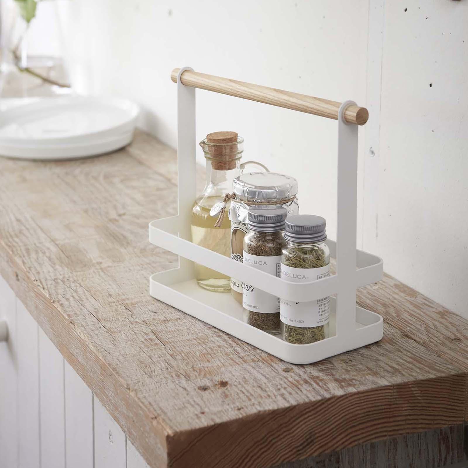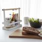 This stylish Tosca Tabletop Spice Rack by Yamazaki is a decorative addition to the kitchen table and can store a variety of spices added while eating. It has room for different spices or oils. It’s made of steel and wood. Designed in Japan.