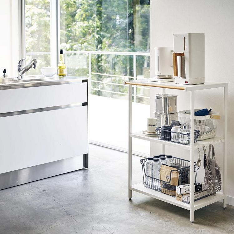 This simple yet stylish Tower 3-Tiered Storage Rack by Yamasaki is a great organizing tool for kitchen. It’s perfect for storing appliances, goods, baskets, and any other kitchen materials. It comes with 5 hooks on the side, which allow you to hang various items. There’s a wooden bar on the front of the top shelf, where you can hang a kitchen towel. It’s made of steel and wood. Designed in Japan.