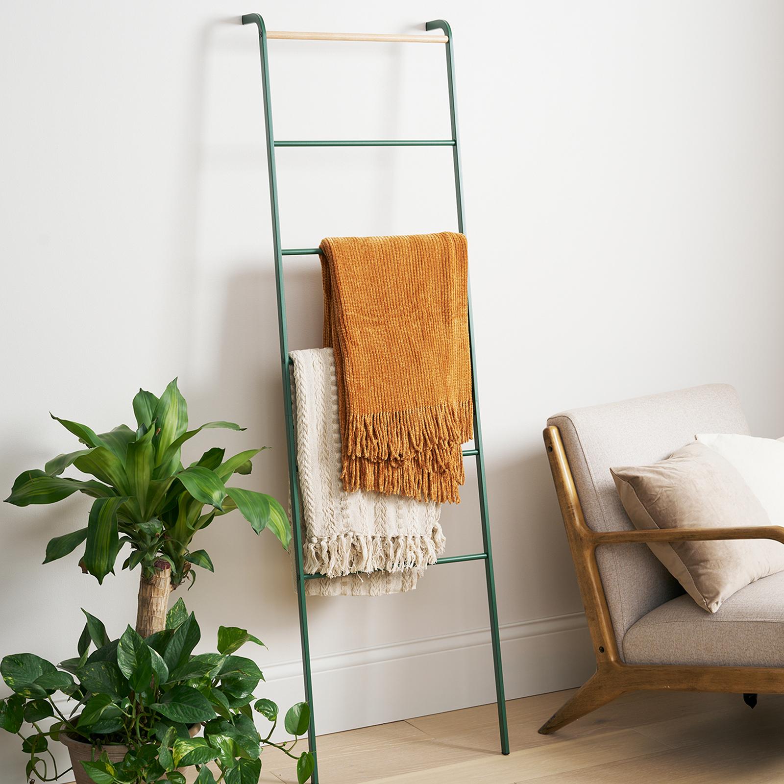 Fashioned like a ladder and made of steel, this hanger made by Yamazaki is perfect for items that are not usually hung. Scarves, pants, towels, and with the use of S-hooks, belts and small bags. Its slim, retro design makes it a stylish addition to any kind of room. It stands up easily against any wall and has a great capacity for holding many items. Made of steel, designed in Japan.