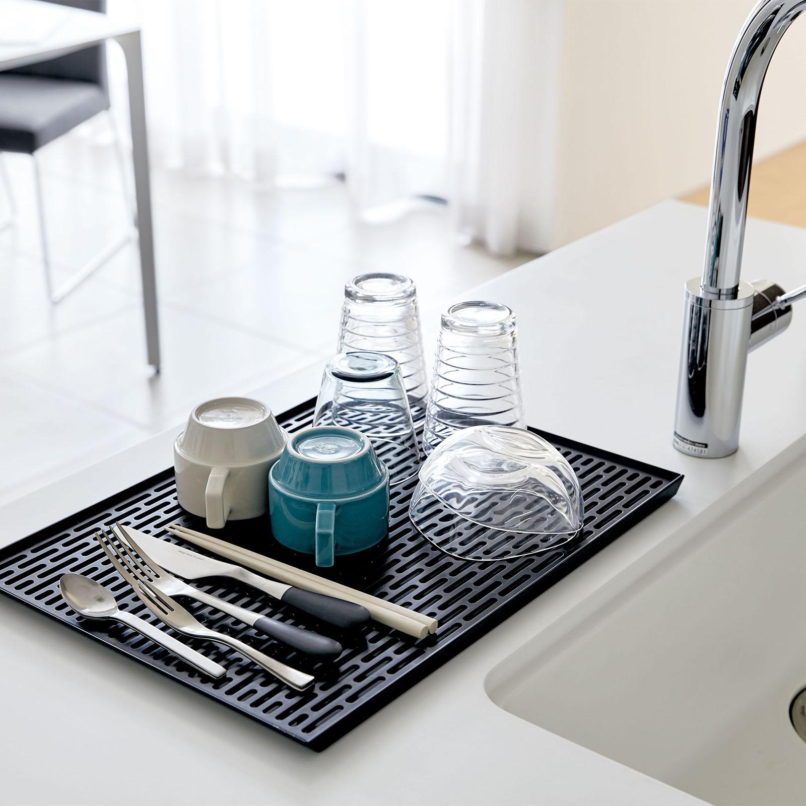 The Wide Sink Draining Mat by Yamazaki is perfect for glasses and mugs that may get damaged in a dishwasher. It fits in right next to a sink, conveniently storing glasses and mugs after washing.