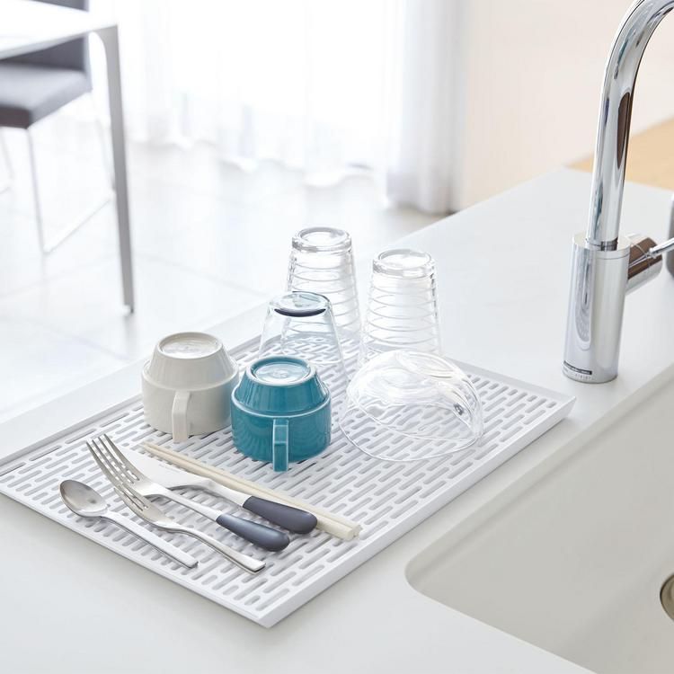The Wide Sink Draining Mat by Yamazaki is perfect for glasses and mugs that may get damaged in a dishwasher. It fits in right next to a sink, conveniently storing glasses and mugs after washing.