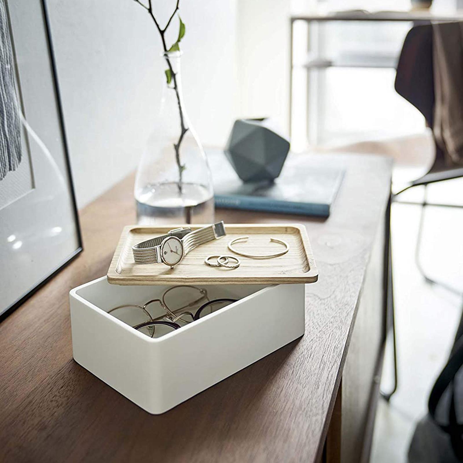 Think inside the box. A charming case for keepsakes, momentos, or accessories. Organize and protect the watches, glasses, and rings you reach for daily. This compact accessories box features a wooden lid that, with its subtle edge, doubles as a catch-all tray. A product that does exactly what it says on the box.