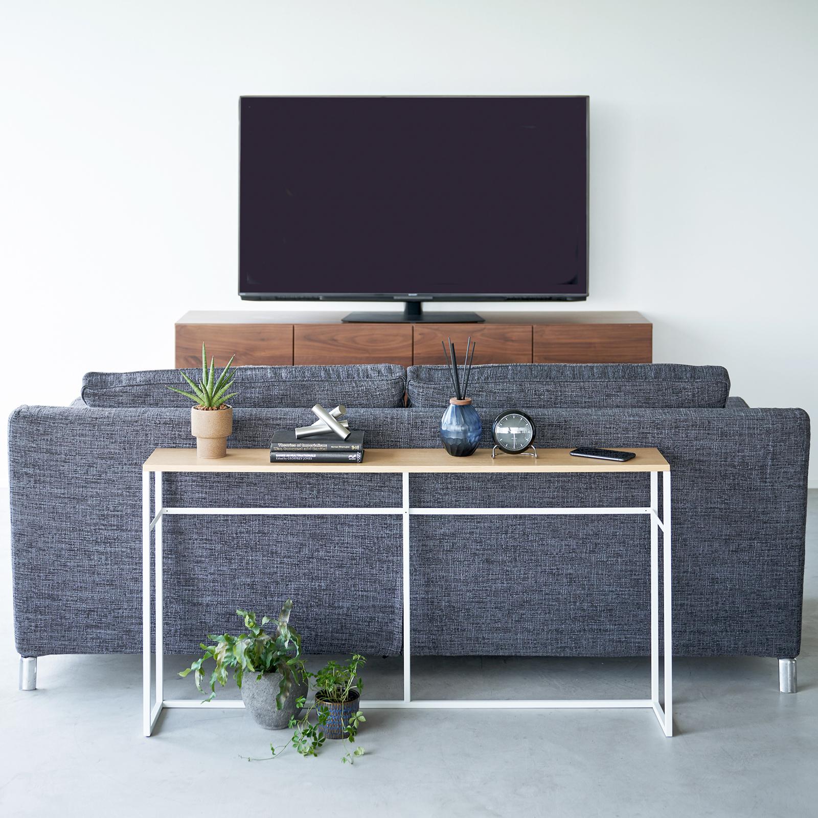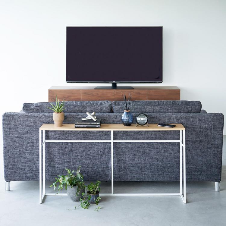 A little table goes a long way. This luxuriously long yet stealthily slim console table will add just the extra storage you need in your entryway or behind the couch. With a natural woodgrain top and minimalistic steel legs, this sleek design magically makes everything placed upon it look intentionally styled. Keep your living room or entryway essentials on the table, umbrellas and other hanging items on the hooks, and perhaps top it off with some decor items to accentuate your space. The shelf-less version features storage hooks and a more open design, while the shelf version provides extra storage for books, remote controls, and other knick knacks.