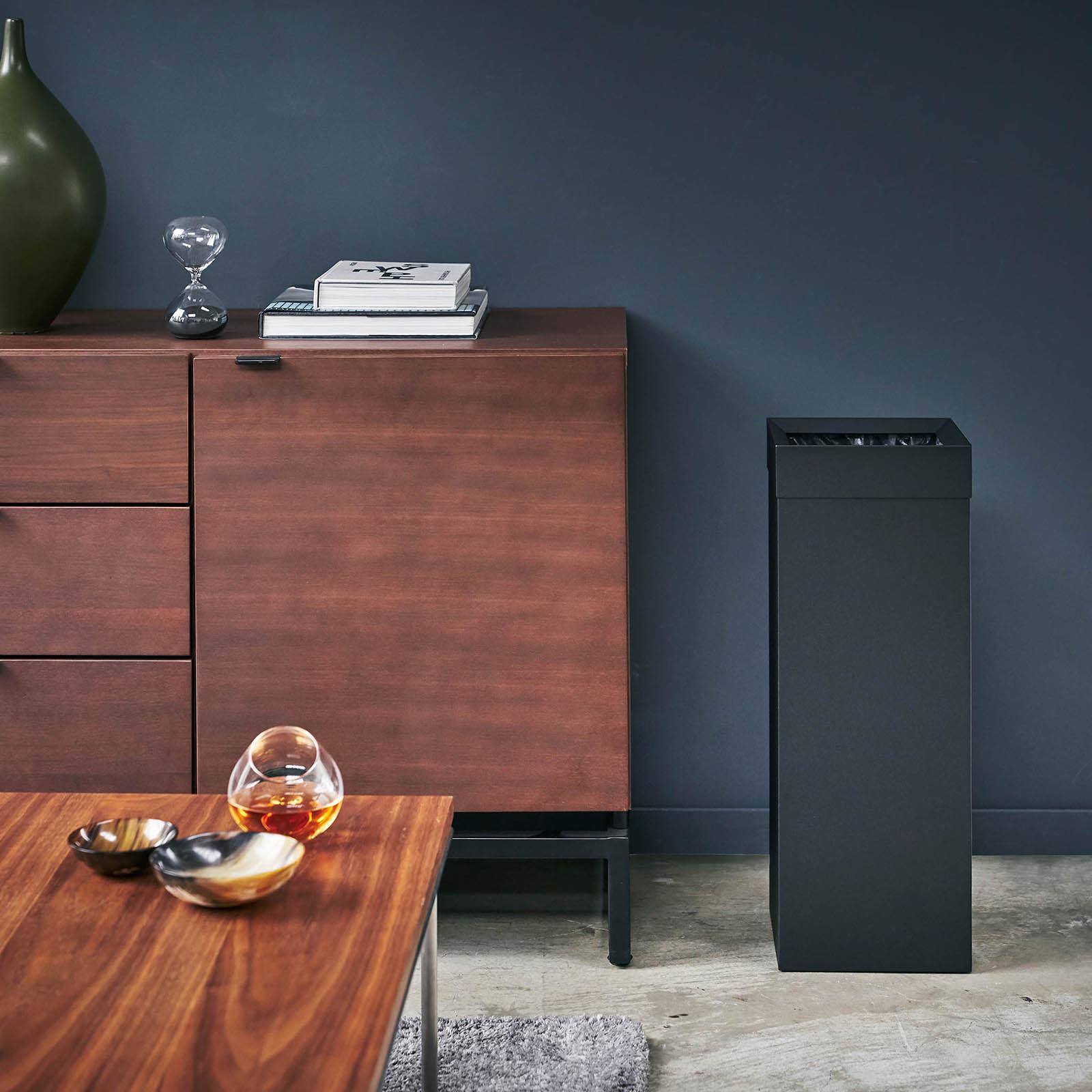 This metal wastebasket seamlessly hides plastic liner bags.Simply hang a plastic bag, then place the lid onto the unit. A cut-out handle makes transporting this a breeze.