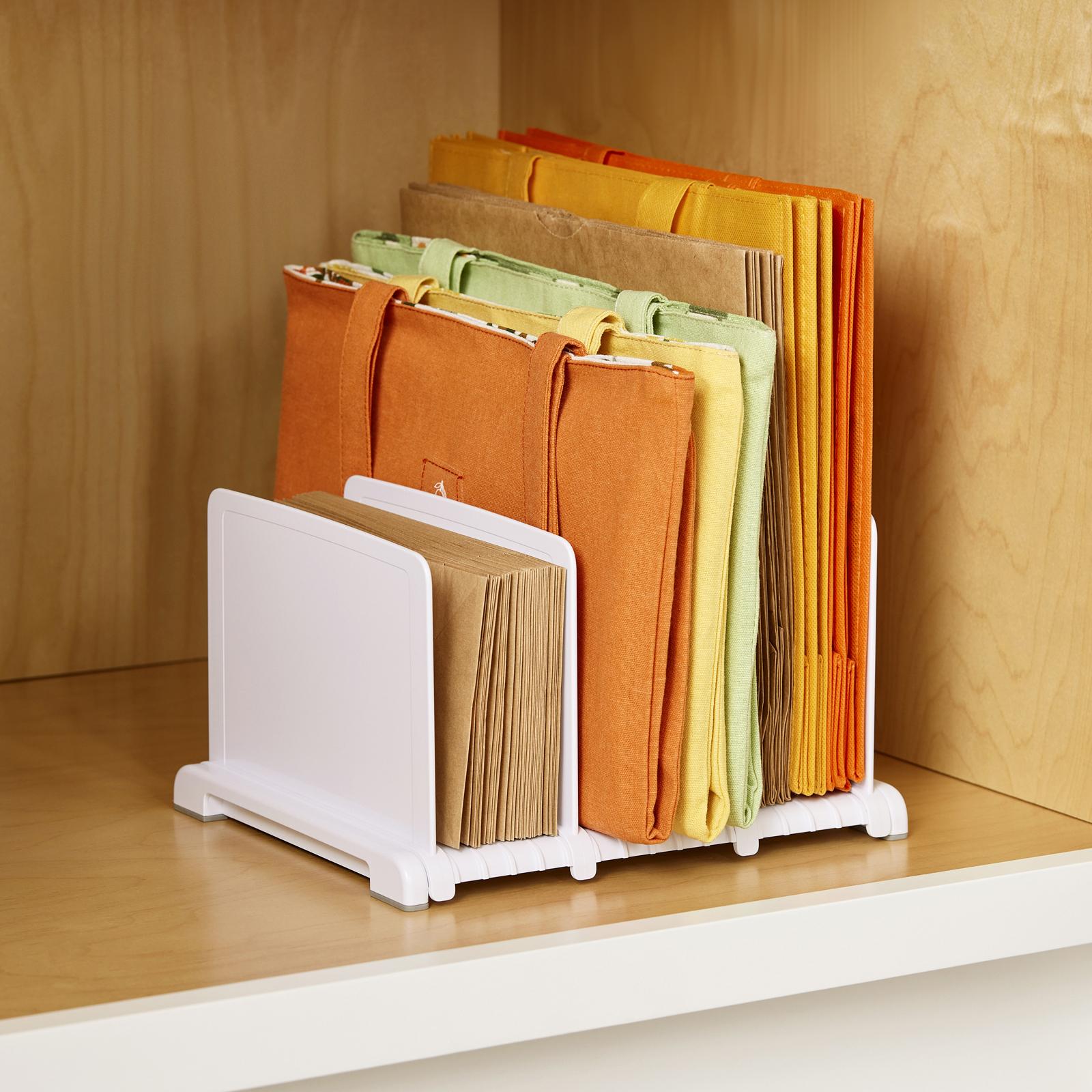 StoraBag Bag Organizer lets you relax before and after your shopping trip. Adjustable dividers keep bags upright for an easy checkout. Folded grocery and lunch bags sit side-by-side so you can store more in one spot. When reusable bags are organized, you’ll be ready for a quick grab at go time.