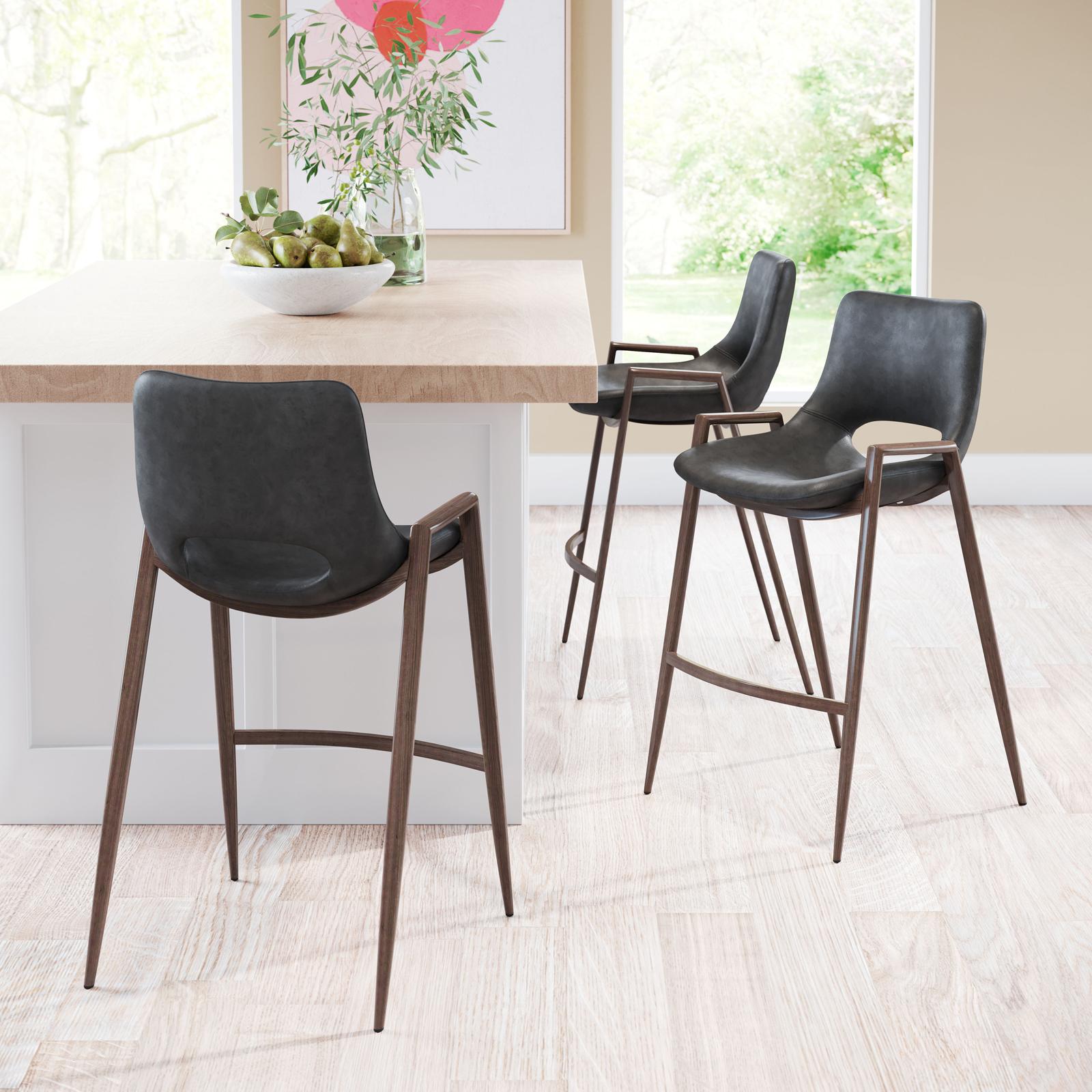 The Desi Counter Chair has mid century modern urban lines and looks great in any space. With a heavy duty vinyl covering and a sturdy steel frame, this counter chair fits in any home kitchen, dining area, or bar. The legs are finished in a walnut veneer coating that is durable for hospitality use.