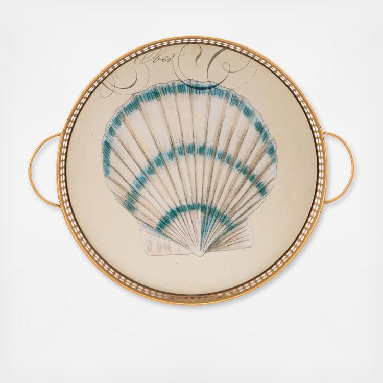 Seaside rustic. This slightly distressed tray with a printed shell accent will add a coasatl vibe to your space. Functional and decorative with generous handles for serving.Generous in scale, it’s a nice size to place on a large ottoman or kitchen island.
