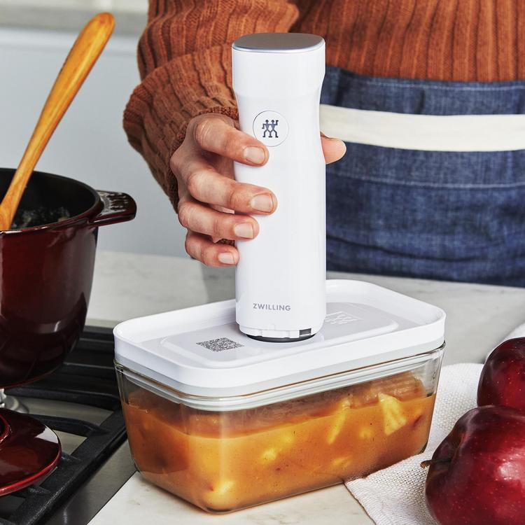 With the Fresh & Save system, you can shop once a week and refrigerate or freeze fresh fruit, vegetables, meat, and fish in our vacuum containers and bags and enjoy the benefits of your own fresh market at home. Prepare your meals days in advance and enjoy them as fresh as the day they were cooked. Cook meat sous vide or marinate meat for the grill in just 30 minutes in the vacuum bags and containers. Here's how it works: Dock the vacuum pump onto the container or bag valve and at the push of a button it extracts the air in mere seconds. It stops automatically once a sufficient vacuum has been obtained, locking in flavor, aromas, and vitamins.