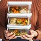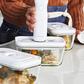 The Fresh & Save vacuum containers are designed to work with the vacuum pump to keep food fresh up to five times longer than non-vacuum storage. They are available in borosilicate glass or BPA-free plastic. Both versions are nestable and freezer, microwave (without vacuum seal), and dishwasher safe. Glass containers are ovenproof (without lid) and double as beautiful serving pieces at the table. Each container style is available in a range of sizes so you can store an entire leftover dinner, a light lunch, or a small to-go snack.