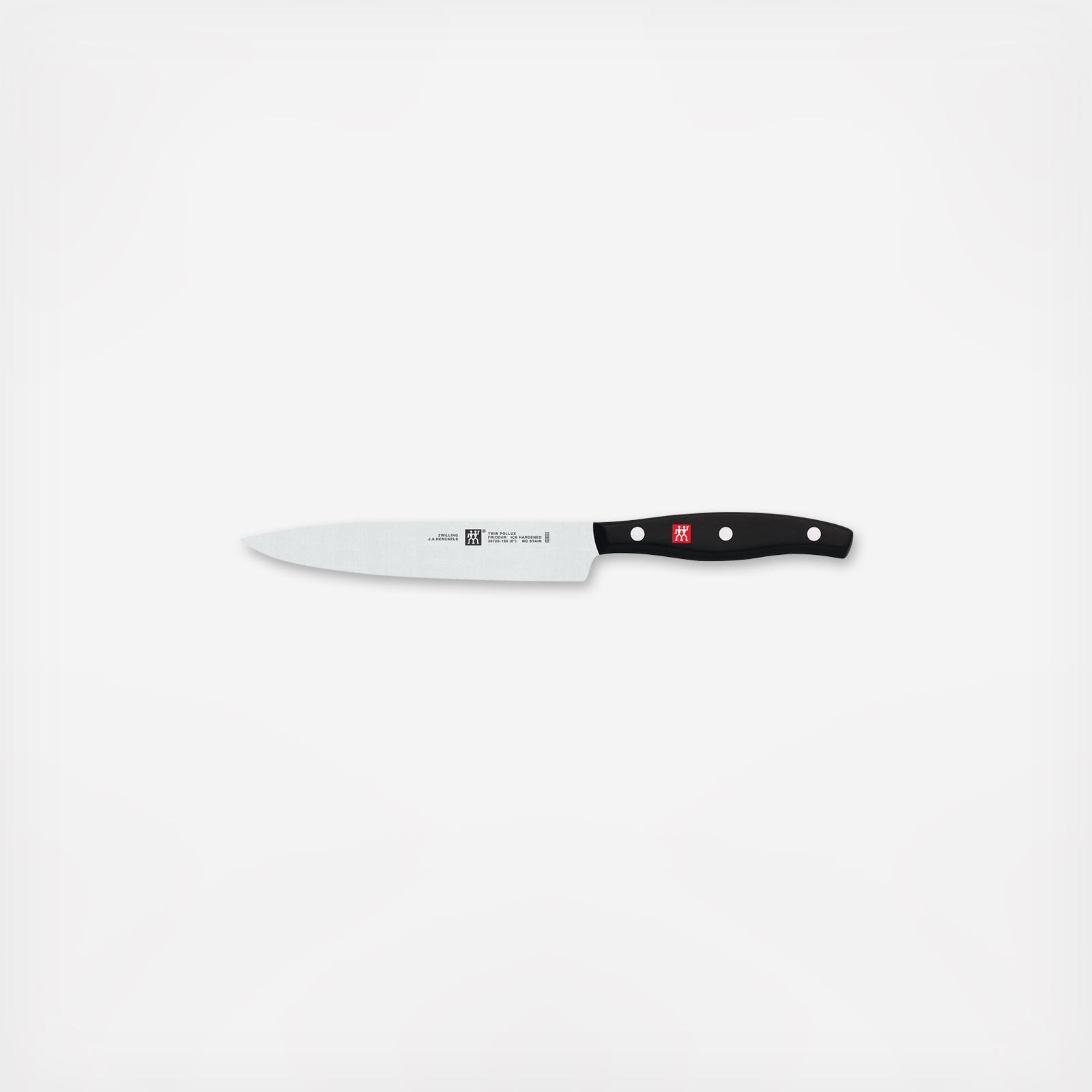 Twin Signature knives are precision stamped from a single piece of German steel, resulting in lighter weight knives that do not compromise sharpness. The knives are made of proprietary special formula steel that has been perfected for over 280 years. Combined with Zwilling's signature ice-hardening technique, these friodur blades are harder, sharper, they will not stain or chip and they retain their sharpness longer. To ensure an ideal cutting angle, the laser-controlled edge is incredibly sharp and is honed and hand-finished by the most skilled artisans. The three-rivet handle embedded with the Zwilling J.A. Henckels logo provides optimum durability.