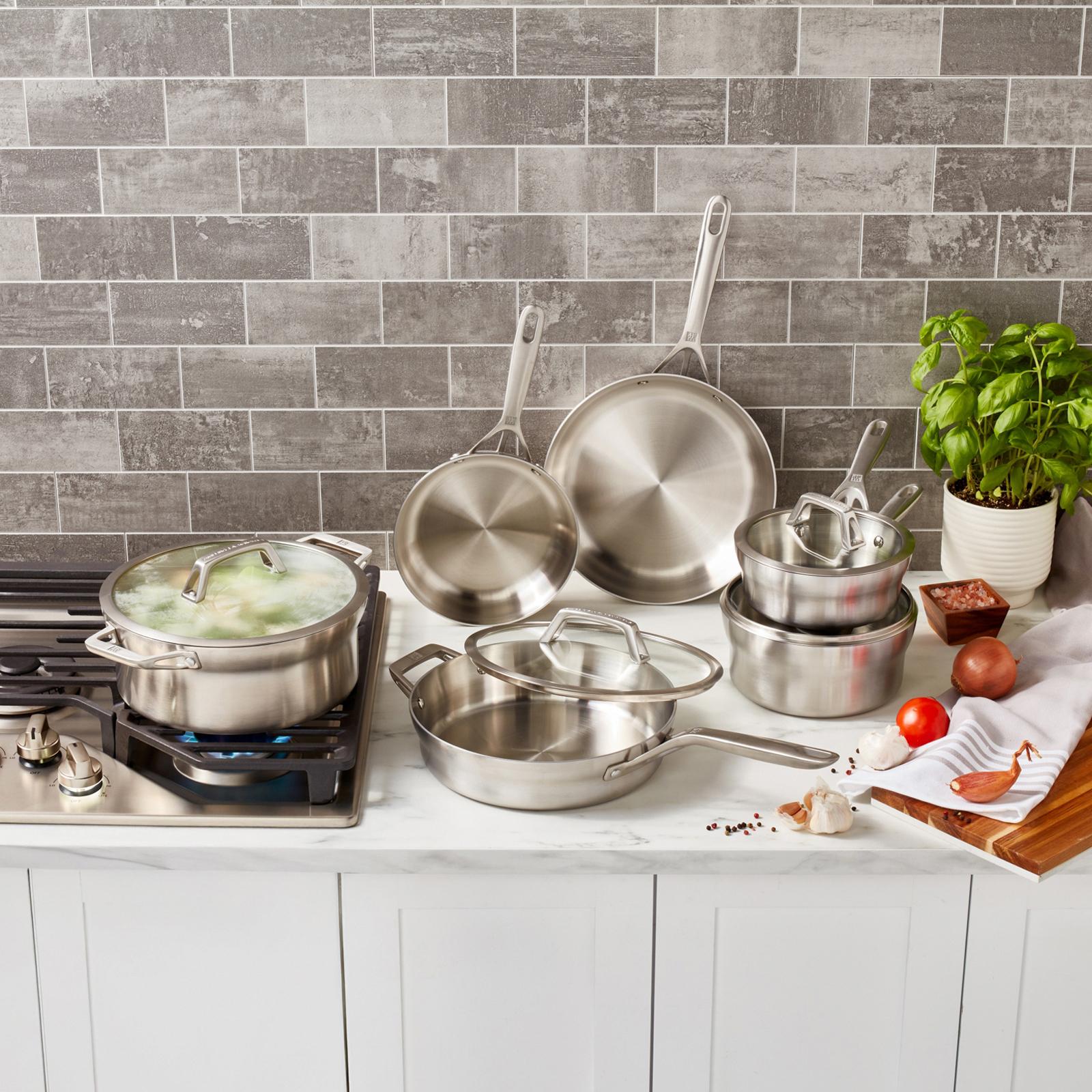 ZWILLING Motion Stainless Steel Cookware merges the best of Italian design with expert German engineering. Inspired by the elegance of Italian architecture, ZWILLING Motion blends quality craftsmanship with modern innovation to deliver high performance cookware made from pure, naturally no-coating stainless steel. Our durable, naturally no-coating surface is built to last a lifetime designed for clean, safe cooking every time you use it. Crafted with thoughtful, streamlined details, ZWILLING Motion offers exceptional performance that lasts. The pure stainless-steel construction with aluminum core provides fast and even heating so you can brown, sear and saute with confidence. The double-rivet, stay-cool handles are designed for easy maneuverability and perfect balance. Dishwasher safe, ZWILLING Motion Stainless Steel is also easy to clean, making this simple-to-use cookware a pleasure to cook with. Non-toxic, tri-ply, stainless-steel construction from rim to rim, Thick aluminum core delivers quick, even heating with no hot spots, Double-rivet stainless-steel handles for maximum maneuverability, Loop handles for easy hanging storage, Tempered glass lids lock in moisture and let you monitor your cooking,Compatible with all stovetops, including induction,Oven safe to 500°F, glass lids to 400°F