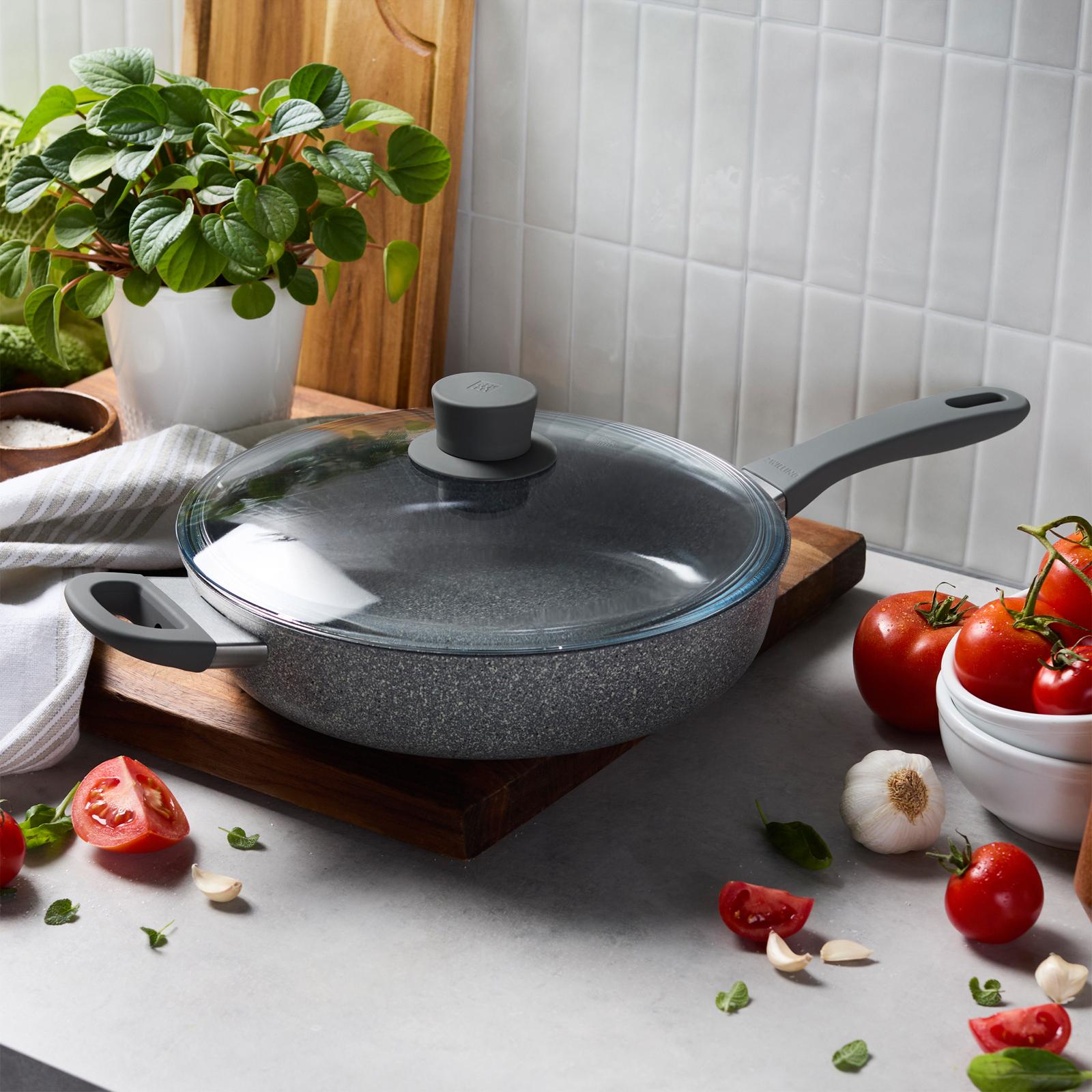 Say Ciao! to Italian-made cookware that delivers a healthier option for every meal. Parma Plus Ceramic cookware is the ultimate choice for the home chef who craves low-effort, high-performance results. With a lightweight, quick-heating construction and a smooth ceramic nonstick coating, Parma Plus offers superior performance for effortless weeknight meals. The Ceraforce Granitium ceramic nonstick coating is a revolutionary coating designed with responsible materials and is made without the use of PFAS, PFOA, PTFE, lead, and cadmium. The innovative nonstick technology minimizes the need for cooking oil so you can create healthier meals. Thanks to the stay-cool, soft-grip handle and hanging loop, you can easily store your cookware. Parma Plus is compatible with gas, electric, ceramic, and halogen stovetops, and is oven safe to 300°F. ZWILLING Parma Plus is also dishwasher safe, making this easy-to-use cookware a pleasure to cook with. Recognized by the International Organization for Standardization as an environmentally certified company in the cookware industry, ZWILLING Made in Italy is committed to reducing the environmental impact in each stage of the product life cycle. Parma Plus cookware is produced with a reduction in CO2 emissions thanks to energy-saving initiatives like solar power, LED lighting, and thermal energy recovery. Fast heating, extremely pure aluminum body for superior browning and even heat distribution. Non-toxic Ceraforce Granitium ceramic nonstick coating is made without the use of PFAS, PFOA, PTFE, lead, and cadmium. Comfortable, soft-grip, stay-cool handle with hanging loop. Flared rim for clean, drip-free pouring. Compatible with gas, electric, ceramic, and halogen stovetops. Oven safe up to 300°F/150°C.