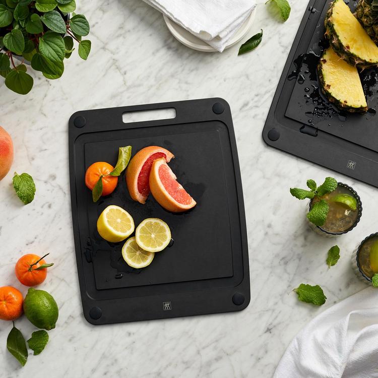 Bring plant power to your kitchen for a better, more durable start on prep work, designed for everyday convenience. Carve turkey, slice steak, and break down melons on this roomy board thanks to the deep juice groove that catches liquids and prevents messes.Exceptionally durable, yet thin and lightweight, these dual-sided boards deliver unmatched versatility and sophisticated style. And the smooth, knife-safe surface makes cleanup a breeze. Give your board a quick rinse or wipe-down, or pop it in the dishwasher for an even deeper clean.BPA-free, Zwilling plant fiber boards provide a more natural alternative to traditional plastic boards. Combining lightweight durability with the sustainability of wood, our boards blend the best of both worlds. The non-porous surface is resistant to staining and absorbing odors, reducing cross contamination in the kitchen.
