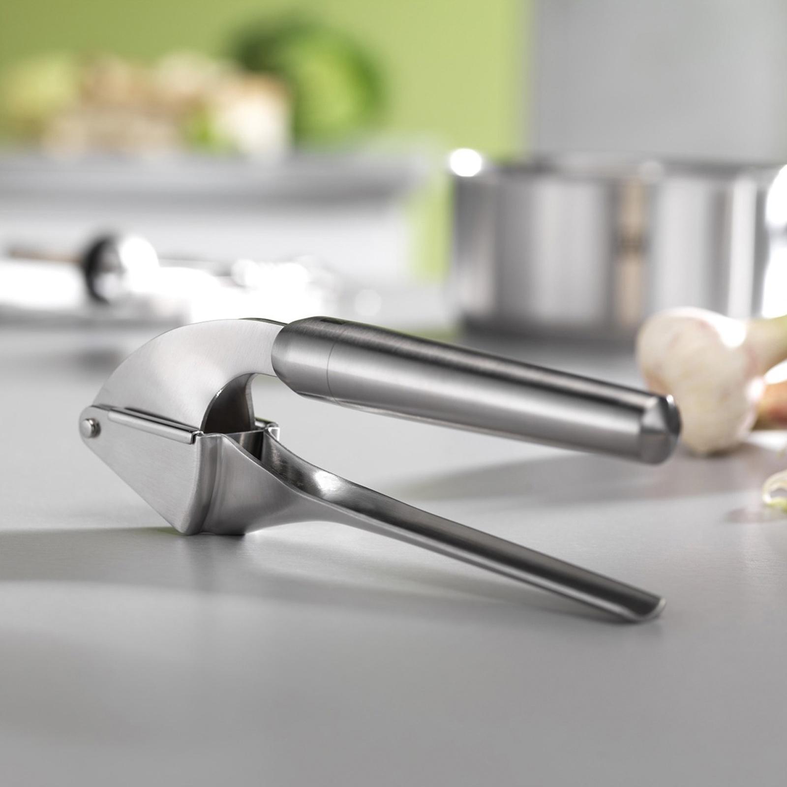 Garlic is an essential ingredient in many dishes. It lends them that certain something and is also incredibly healthy. The Zwilling Pro series garlic press helps you to perfectly prepare the cloves. The ergonomic handle allows you to press garlic with minimal effort. The kitchen gadget is made of premium stainless steel that is also flavor neutral. Whether you are pressing peeled or unpeeled garlic cloves, the results are always excellent thanks to the ergonomic handle, dual presses and efficient grid design. The timeless design by Matteo Thun and Antonio Rodriguez has resulted in a visually captivating garlic press that perfectly combines functionality and beauty. Because hygiene plays a particularly important role in garlic preparation, special care has been placed on facilitating easy cleaning. The sieve folds out to allow it to be cleaned with running water. The press can also be cleaned in the dishwasher.
