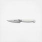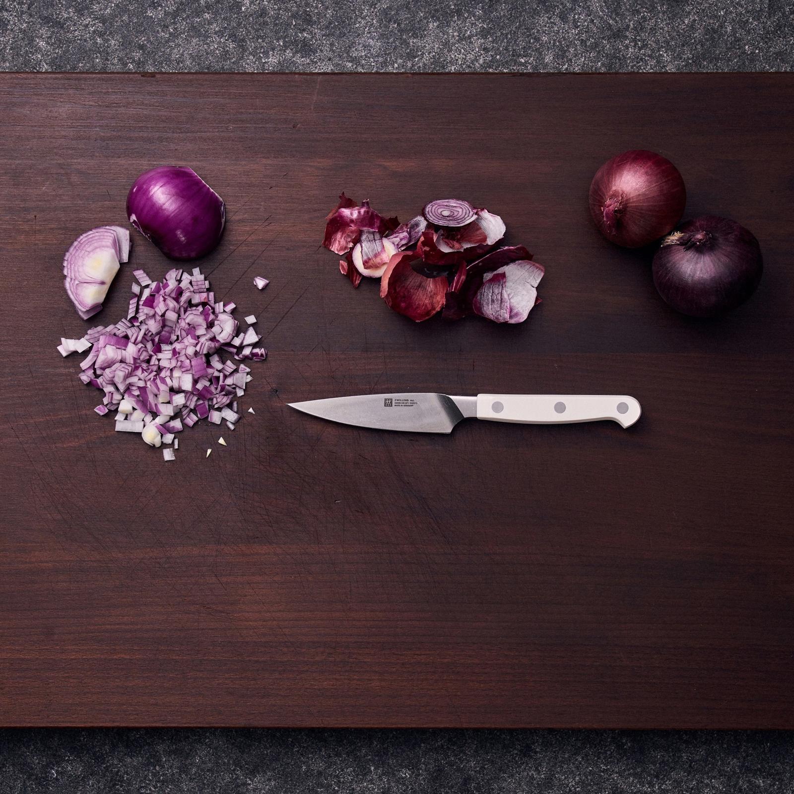 The paring knife is essential for small-scale tasks like peeling vegetables, segmenting fruit, and slicing garlic. Make precise and detailed cuts with ease.ZWILLING Pro, the most user-friendly knife on the market, is now available with elegant matte white handles. ZWILLING Pro Le Blanc boasts a unique curved bolster that acts as an extension of the hand, supporting the professional pinch grip, with thumb and index finger on the blade, for safe cutting and less fatigue. The blade was designed with a broad curve in the front to facilitate the rocking motion of Western cutting, while the straight back is ideal for the Asian chopping motion. The full length of the blade can be used when cutting and can be sharpened from bolster to tip.