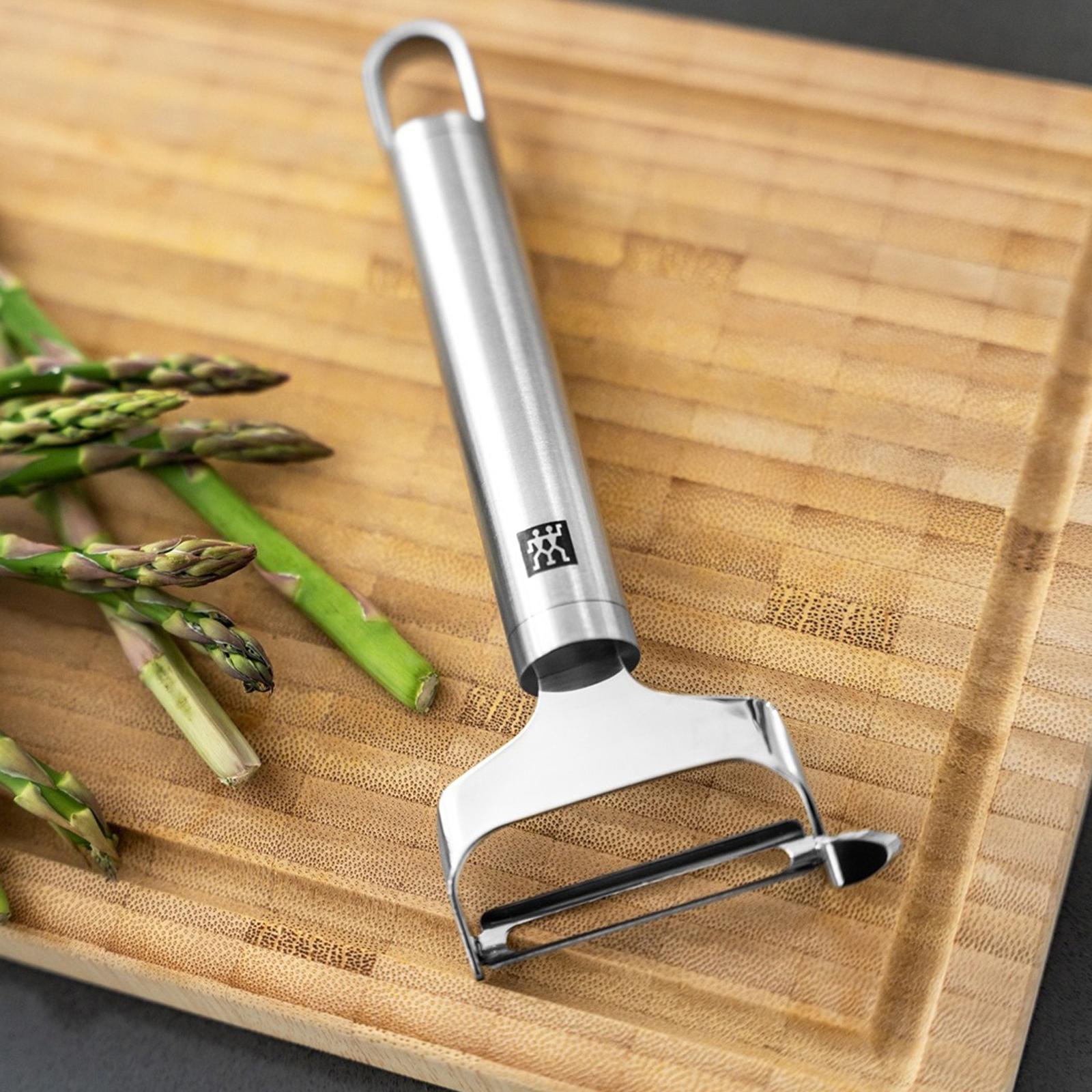Peeling is a frequent cooking task - and one that's particularly easy with the right kitchen gadget. The Zwilling Pro series Y-peeler with diagonal blade is ideal for long, thin vegetables and its ergonomic design makes the task much easier. The swivel design allows the twin blade to safely move over a wide range of vegetable shapes and peels in both directions. The vegetable peeler's design is perfectly adapted to the task: The blade slits are positioned to prevent peel from becoming caught up and adjust to any kind of vegetables. However, the Pro series doesn't only focus on unconditional functionality. Internationally known designers Matteo Thun and Antonio Rodriguez place particular importance on minimalistic design in the Pro series to ensure that it remains contemporary even years from now and still look good in any kitchen.The uniform design language of the series means that all the kitchen gadgets visually complement each other to create a harmonious overall impression. The premium quality stainless steel is hygienically designed to avoid any unnecessary seams. This means that the diagonal Y-peeler is dishwasher- safe, sturdy, durable and corrosion-free.