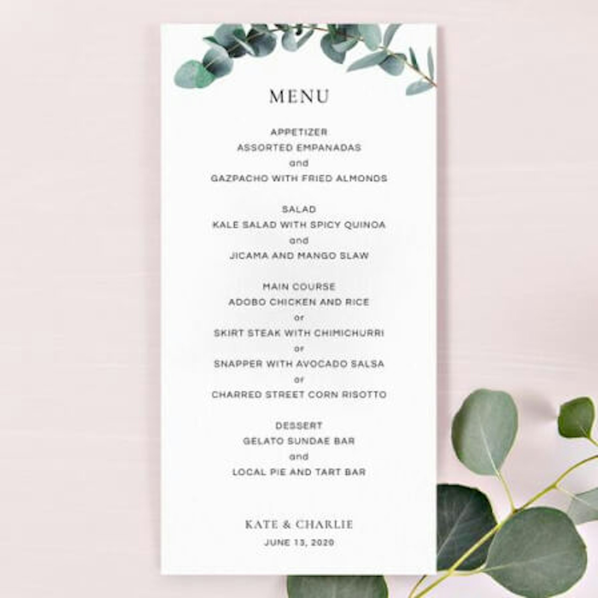 The basics are save the dates, wedding invitations, and thank you cards. For the big day, many couples print programs for the ceremony that list out the bridal party and details like readings and song names. Menus are a lovely touch, too. Finally, don't forget the wedding place cards for your guests! You can get all of this paper at Zola, and even create a matching suite.