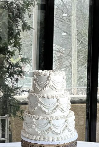 “Petite Fleur Cake was an absolute pleasure to work with for our wedding. Their communication was always clear, punctual, and easy throughout the entire planning process. We wanted a Chinese-style wedding cake, with lots of red and gold, and white accents for contrast. The final product was simply perfect: the cake was gorgeously decorated, moist and soft, and tasted absolutely delicious. She designed these adorable longevity peach cake toppers for the bride and groom (IYKYK), and beautiful gold flowers and blossoms.
