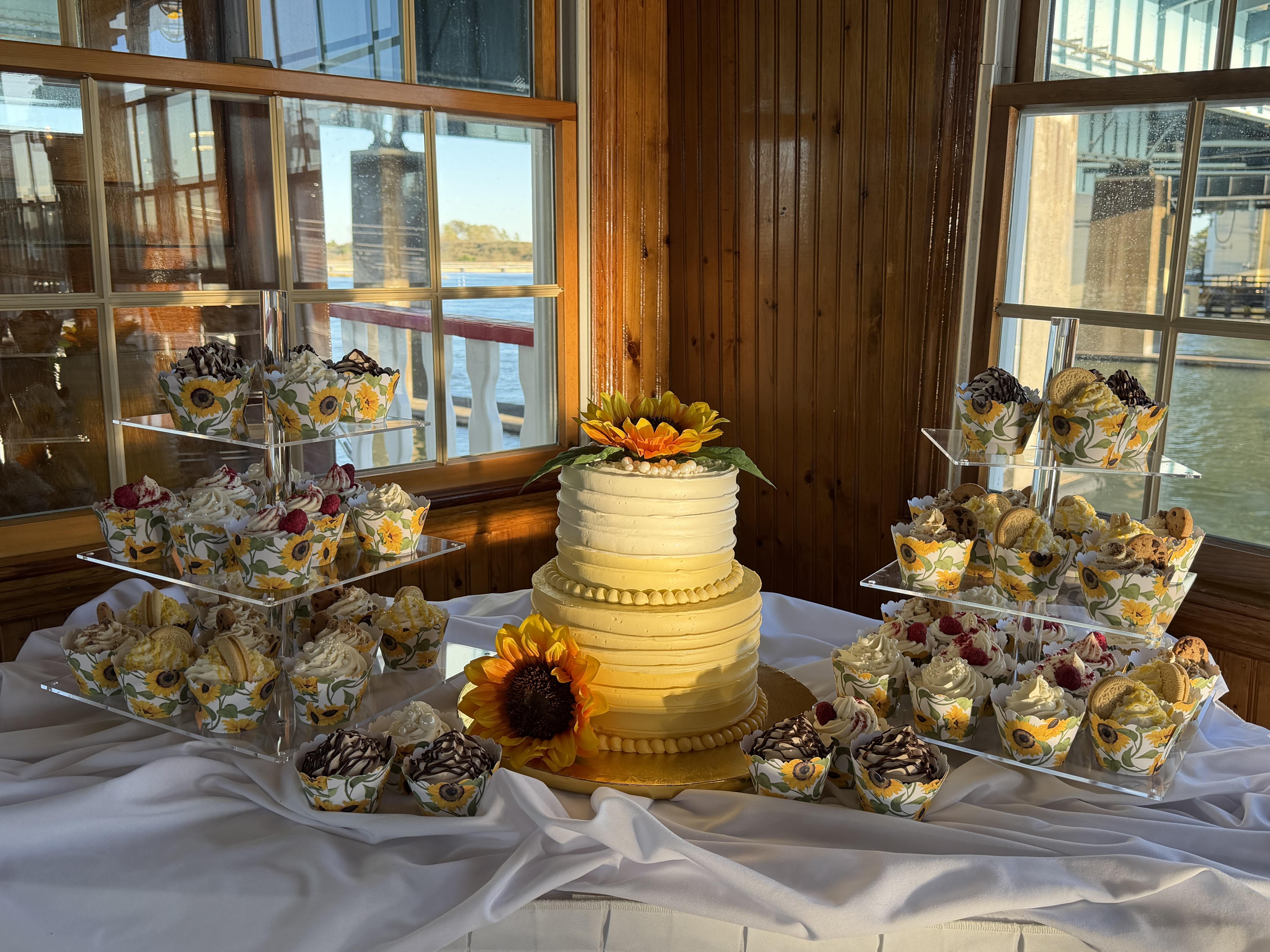 My husband and I were looking for someone to make a 3 tiered, 3 flavor cake for our fall wedding and Hello Sunshine Treats delivered! We had apple cinnamon, dulche de leche and espresso. Everyone raved about the not-so-common flavors! Not only that but Nikki (the owner) made a whole dessert table as well! We still have people tell us how delicious our desserts were. Thank you again!!!