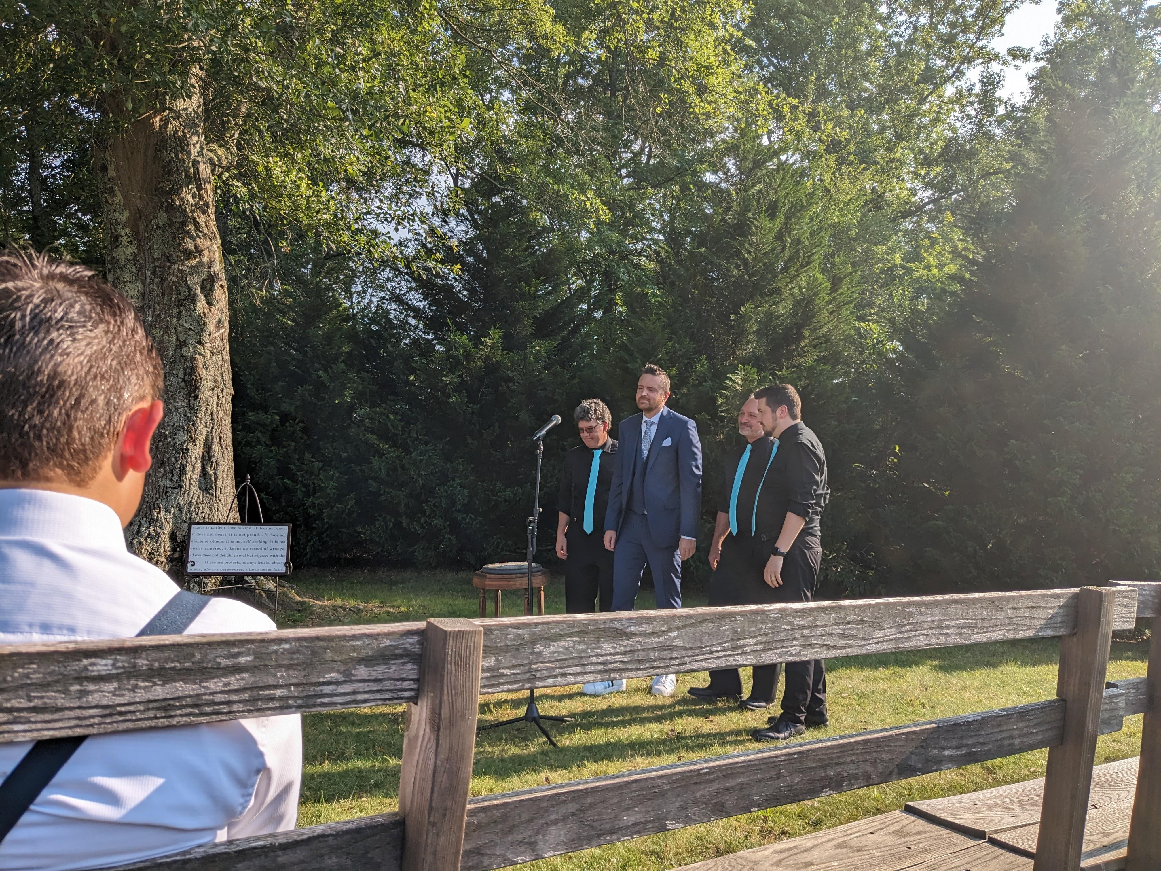 A talented barbershop quartet will sing 2-4 a cappella songs during or before the ceremony. You may choose from our existing repertoire of romantic or fun songs to entertain and delight the crowd. We will sing acoustically with no mics, unless you have vocal mics provided. Price assumes minimal extra time required to be present, and close proximity to Fulton County. Our quartets are a great way to supplement any wedding ceremony with beautiful, memorable 4-part harmony. Moderate notice required.