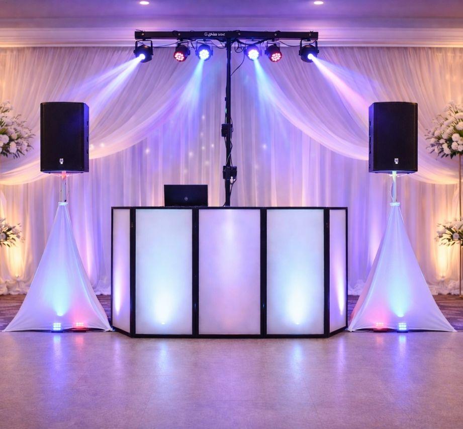 Our Deluxe Wedding DJ Package delivers a high-energy reception with live DJ mixing, professional sound, and dynamic lighting that keeps the dance floor alive. This package includes, two professional speakers, wireless microphones, wired Microphone for toasts, and a sound-active illuminated DJ booth that reacts to the music and enhances the DJ setup. Dance floor lighting adds excitement and atmosphere while our DJ keeps the celebration flowing smoothly from start to finish.