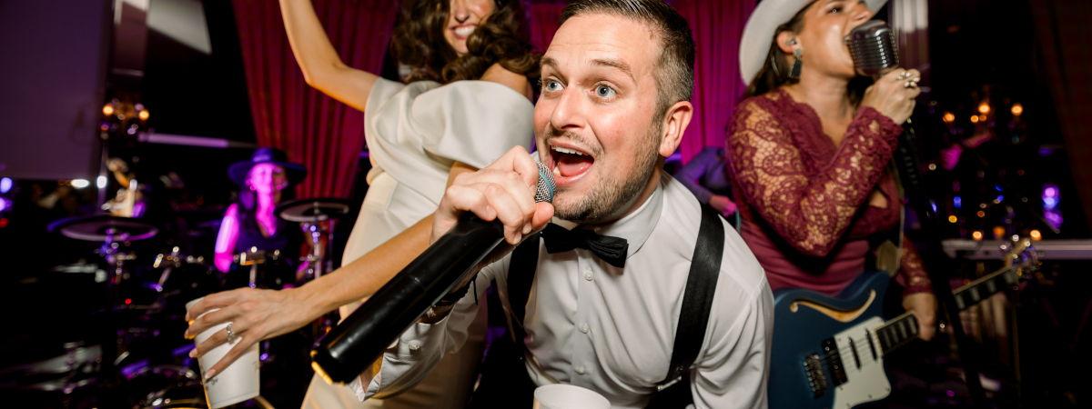 Diverse Repertoire: country, 70s, 80s, classic rock, Top 40 hits, and more, thanks to multiple lead vocalists. Interactive Performances: members engage directly with guests—joining the dance floor with wireless microphones, handing out tambourines and cowbells, encouraging sing-alongs— praised in countless client testimonials. Our Signature from 1999! Wedding & Corporate Expertise: The band offers comprehensive wedding services including emceeing, special dances, schedule coordination, and ceremony performances. Personalized Service: Every event gets the band’s core members (not a franchise rotation), with the owner on-site. Consistent!