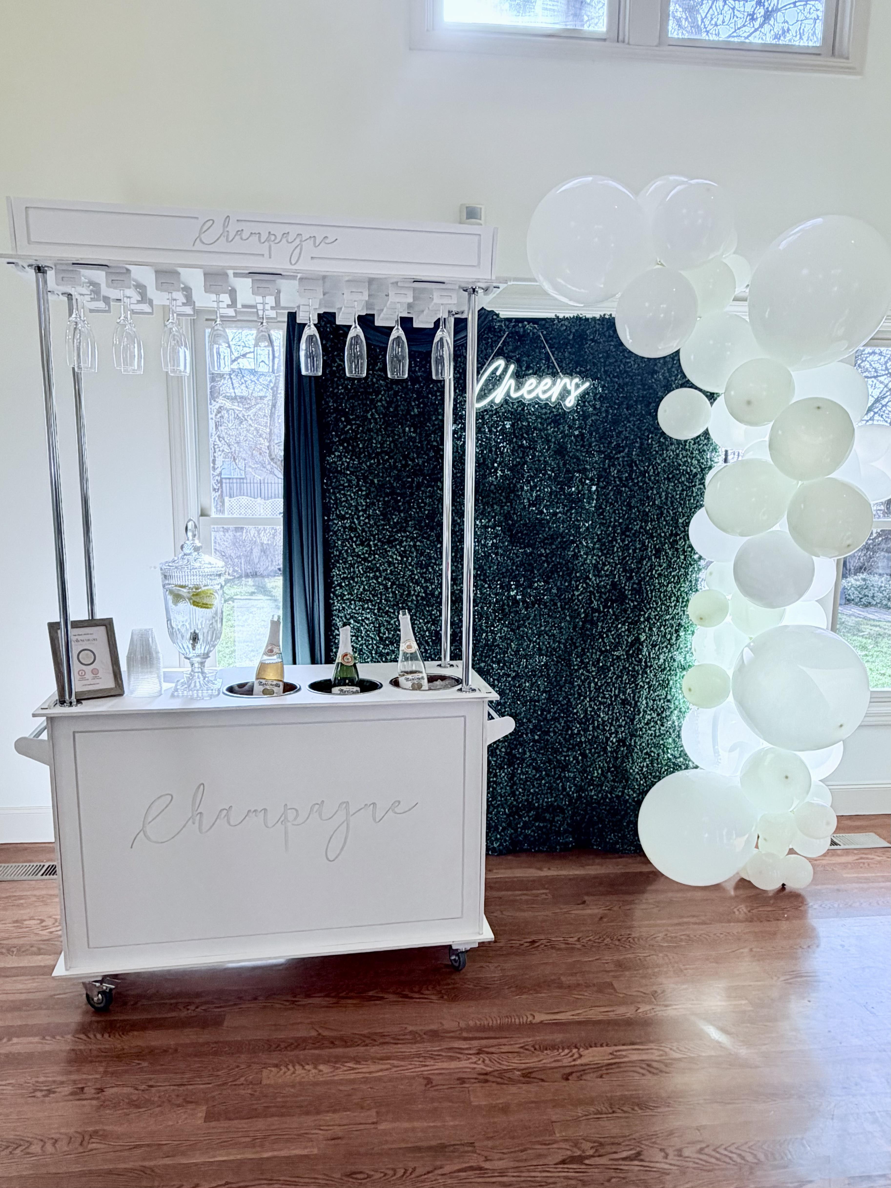 Full service luxury experience. This package includes a 5 hour cart rental styled for your event, a fully licensed server, upgraded drinkware options, custom drink menu or signage. Pairs perfectly with our Champagne Wall. Add on an additional bartender or hours as needed.