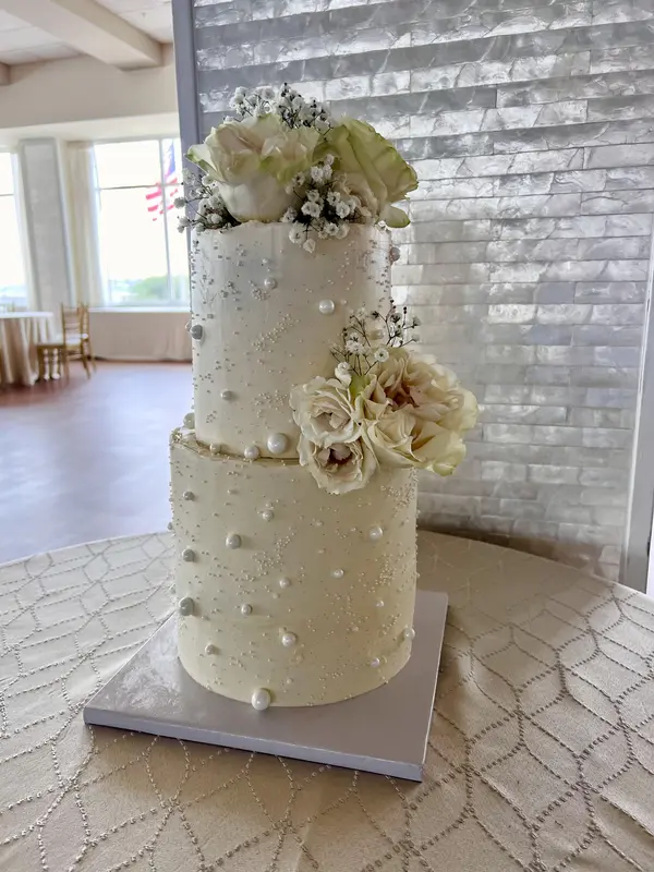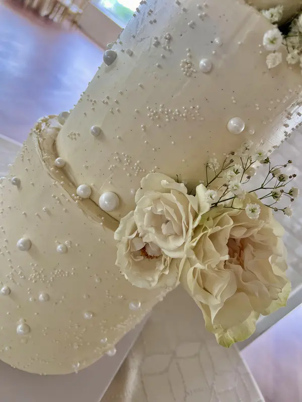 The cake was absolutely beautiful — elegant, modern, and flawlessly crafted. The buttercream was smooth with delicate pearl details, and the fresh ivory roses added the perfect romantic touch. It looked stunning in person and tasted just as good! Truly a gorgeous centerpiece and exactly what we envisioned.