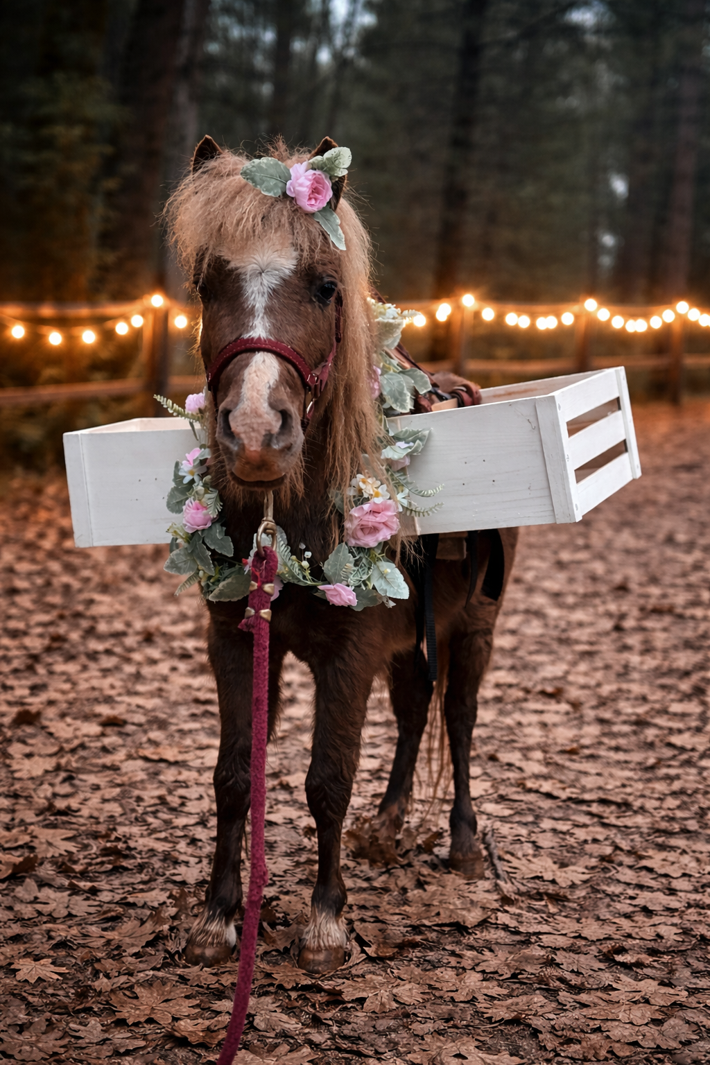 Enjoy 1 hour of beverage display service with your choice of Luke (mini burro) or Lucky (mini horse). Includes two beverage baskets, with optional floral styling available. Perfect for cocktail hour, guest greetings, and unforgettable photo moments.You provide the drinks—we’ll create the kind of experience your guests won’t stop talking about. Additional Mini (not carrying drinks) can be added.