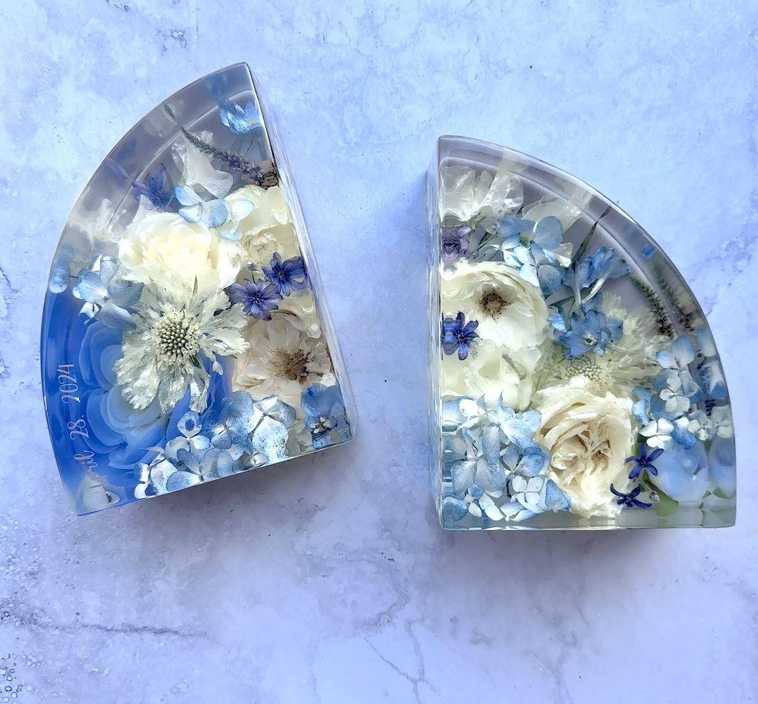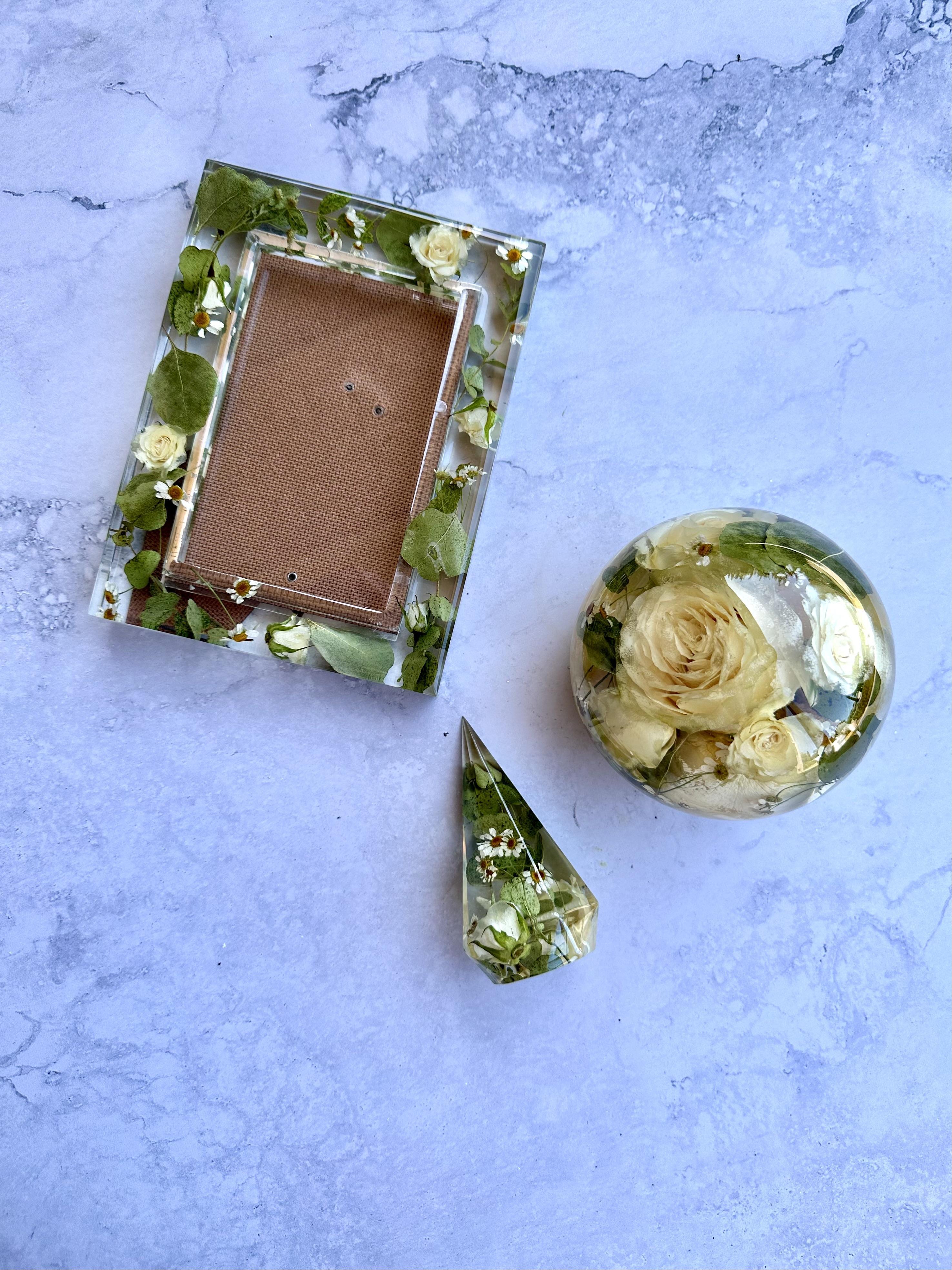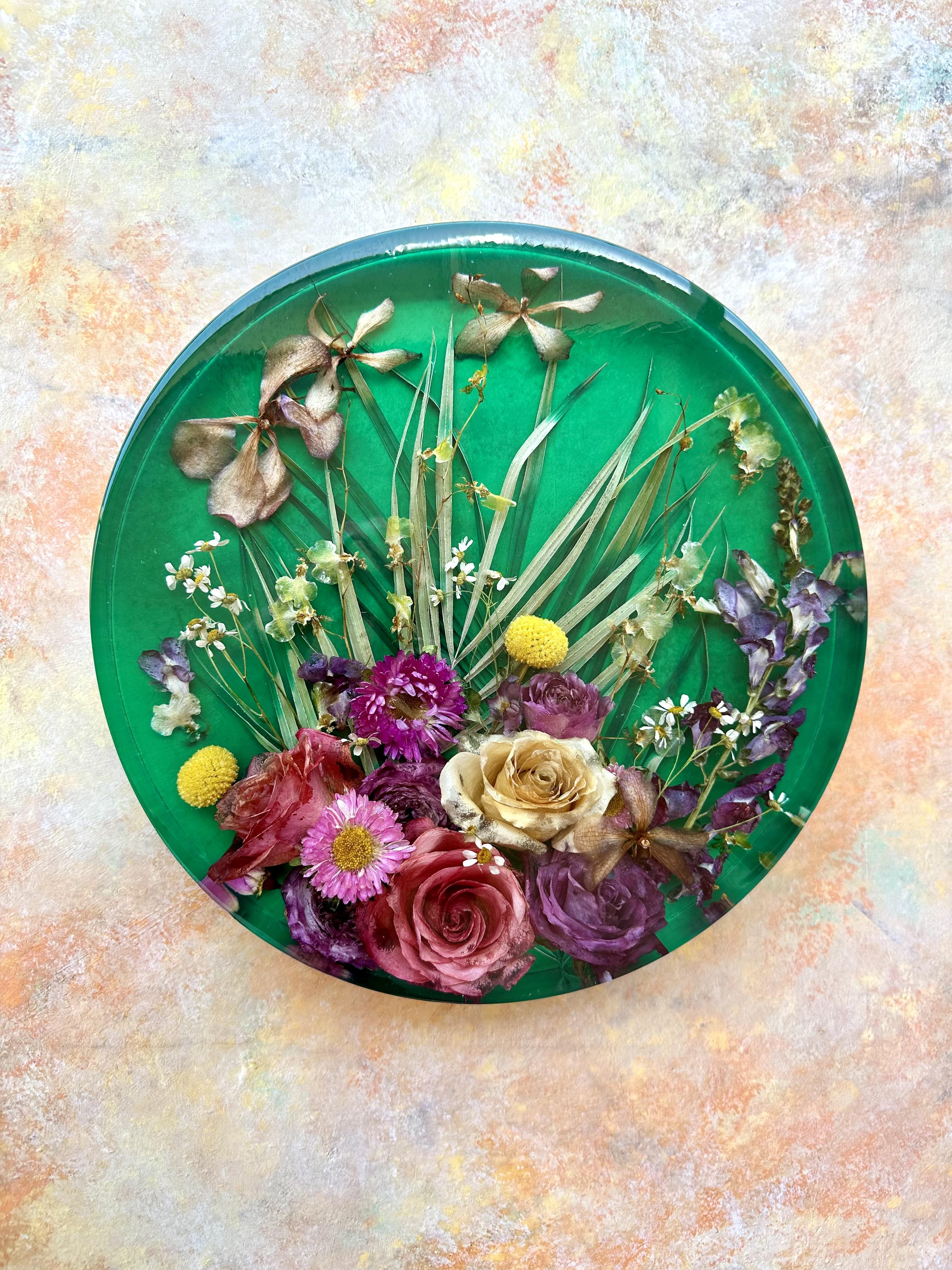 I am the Owner and Artist of Fruit Of The Bloom Boutique, a Los Angeles-based art studio that transforms flowers into functional home decor and bespoke artwork. I dry and preserve real - or faux! - meaningful flowers in epoxy resin, enabling my newlywed customers to have a tangible piece of their Big Day to display in their home for many years to come. Flowers can convey just about any emotion or sentiment, and to be able to turn that ephemeral beauty into a piece of botanical artwork feels magical…every single time!