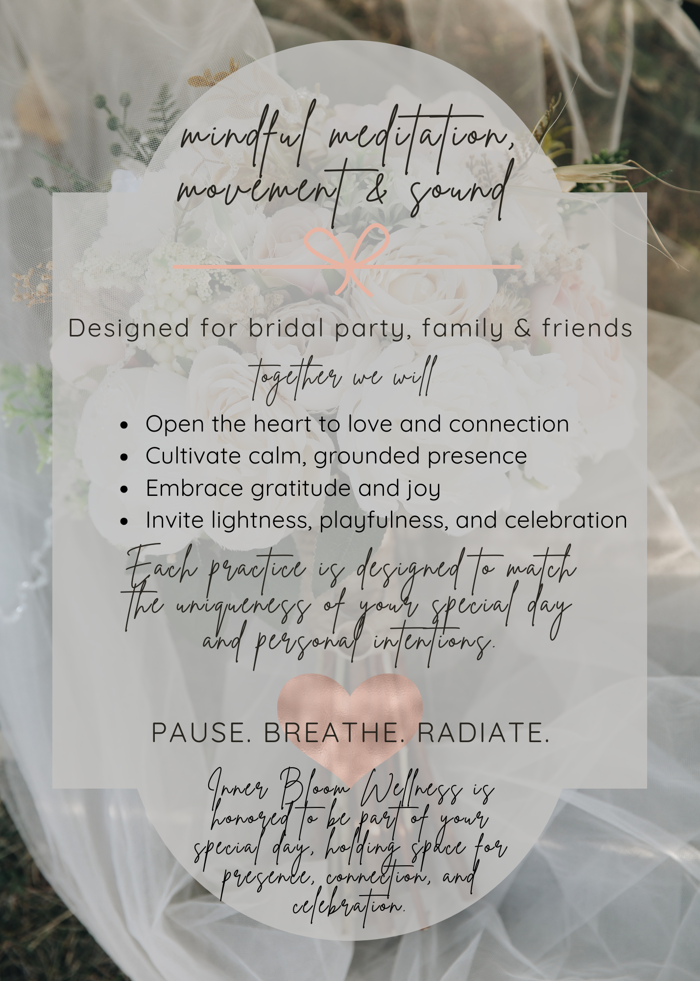 Inner Bloom Wellness offers mindful meditation, gentle movement, and sound experiences designed to bring calm, presence, and connection to weddings and wedding weekends. Created for couples, bridal parties, family, and friends, each offering invites space to pause, breathe, and fully arrive. Blending grounding yoga flows, sound healing, meditation, and breathwork, Inner Bloom Wellness supports relaxation, emotional balance, heartfelt connection and celebration honoring the intentions and uniqueness of your special day.