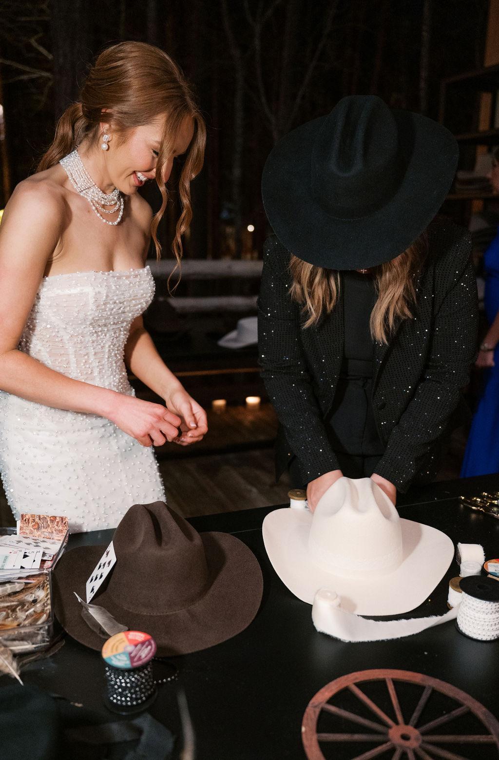 Rancher Hat Bar brings a one-of-a-kind, interactive hat-making experience to your wedding celebration. Perfect for welcome parties, rehearsal dinners, and receptions, our mobile hat bar allows guests to create a custom cowboy or western-inspired hat they’ll wear long after your wedding day. We provide a curated selection of high-quality wool and felt hats, premium embellishments, and expert hat stylists who guide each guest through the process from start to finish.